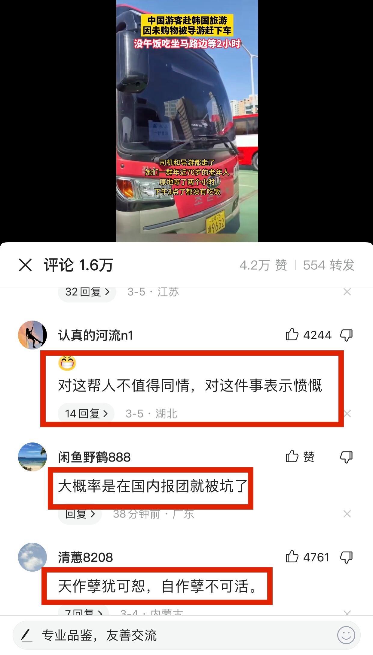 B派網友則認識比較理智,這幫被導遊趕下車旅行團,不是被韓國導遊坑,而是他們在中國報旅行團,只不過是中國導遊坑他們,換了一個地方,導遊還是中國導遊,旅行社還是中國旅行社,B派網友觀點: