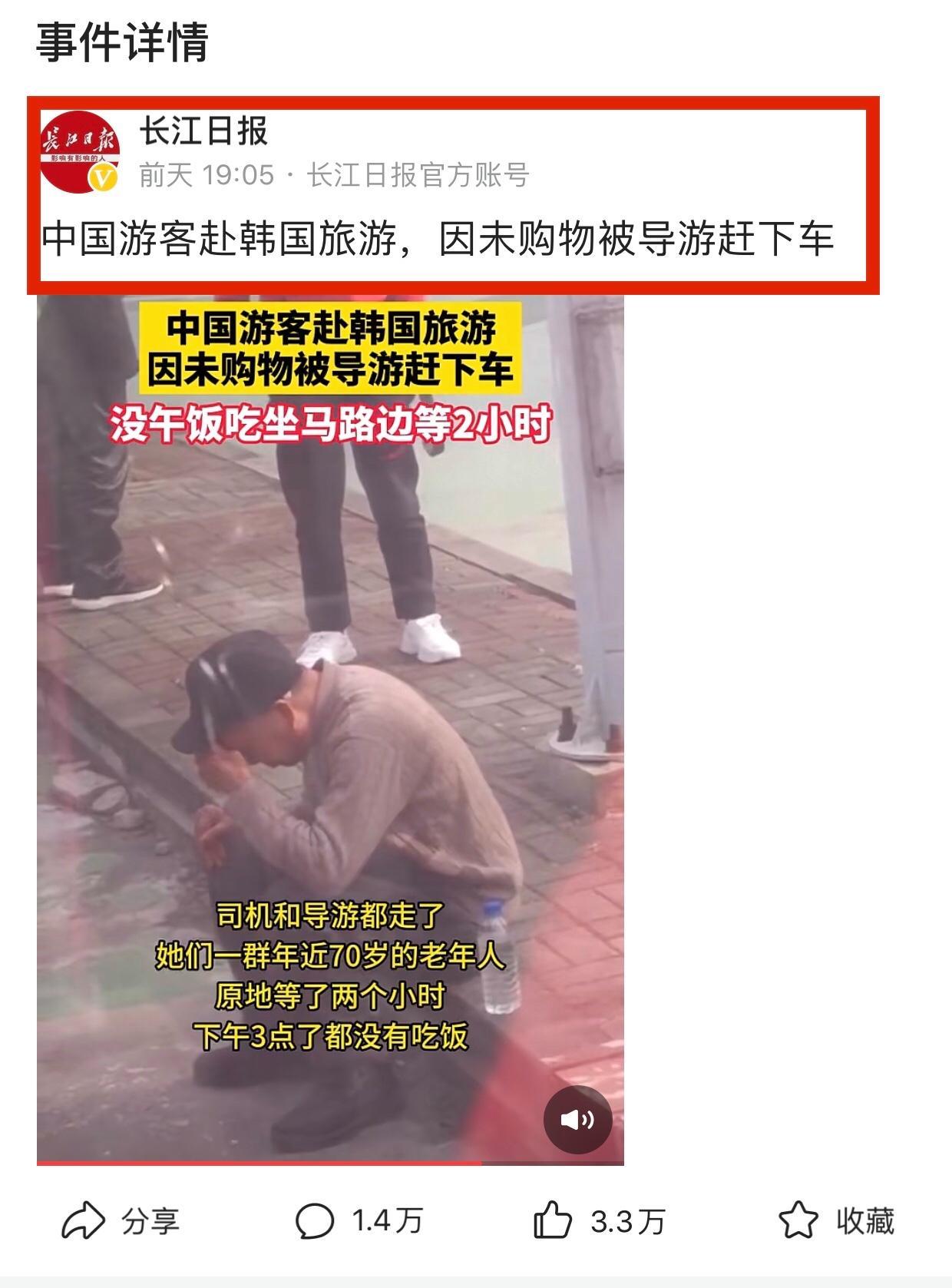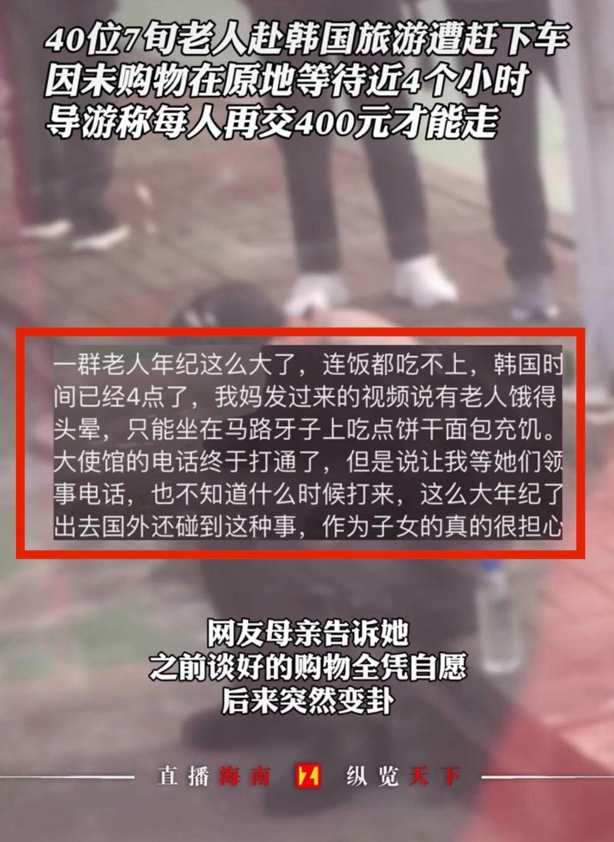 事情起因是2024年3月4日,一位網友求助,講述自己母親跟團遊韓國經歷:一羣老人年紀這麼大了,連飯都喫不上,韓國時間已經4點了,我媽發過來的視頻說有老人餓得頭暈,只能坐在馬路牙子上喫點餅乾麪包充飢。大使館的電話終於打通了,但是說讓我等她們領事電話,也不知道什麼時候打來,這麼大年紀了出去國外還碰到這種事,作爲子女的真的很擔心。