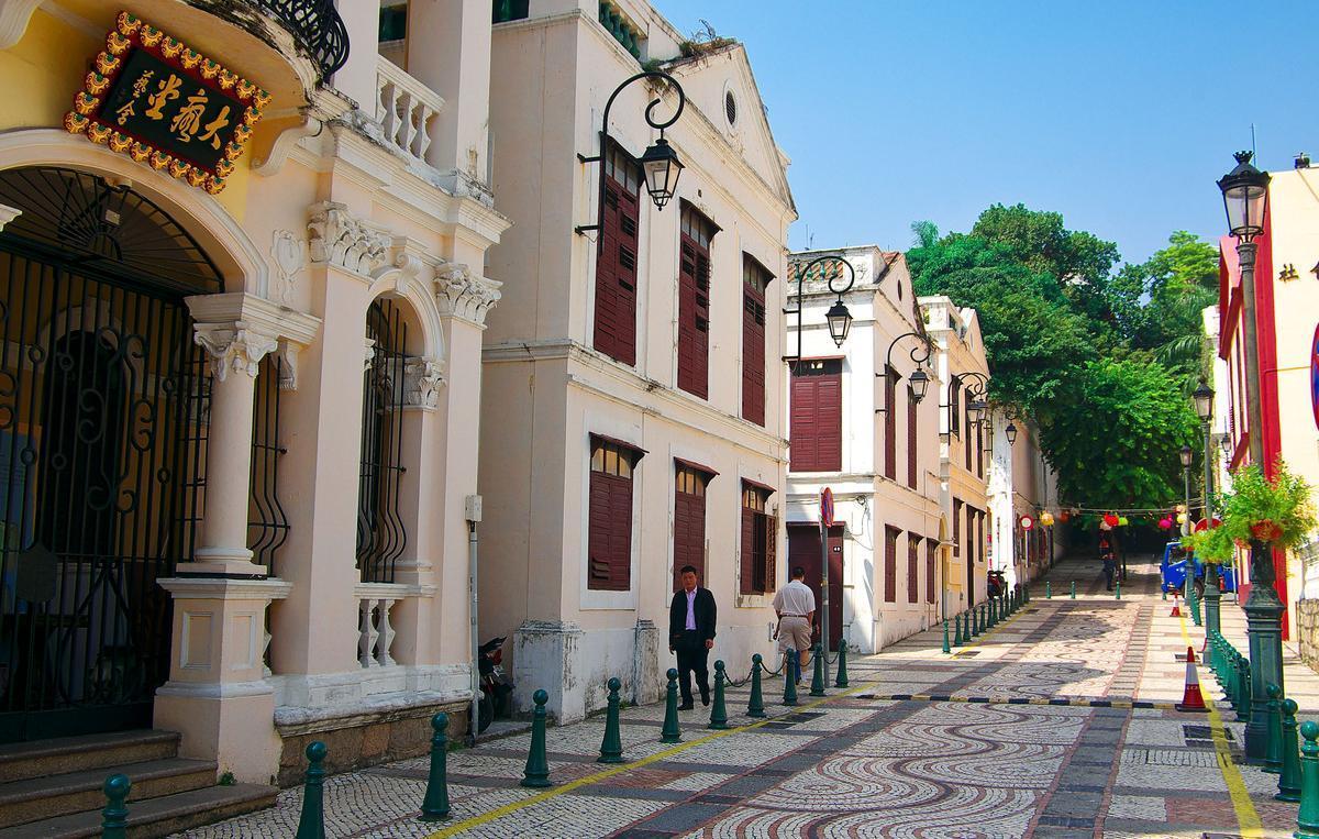 草堆街,澳門典型的老街道,地上鋪着小塊花崗岩拼成的圖案,這裏有中式建築,更多的是西洋樓房,一條短短的街道能感受到中西文化的融合。