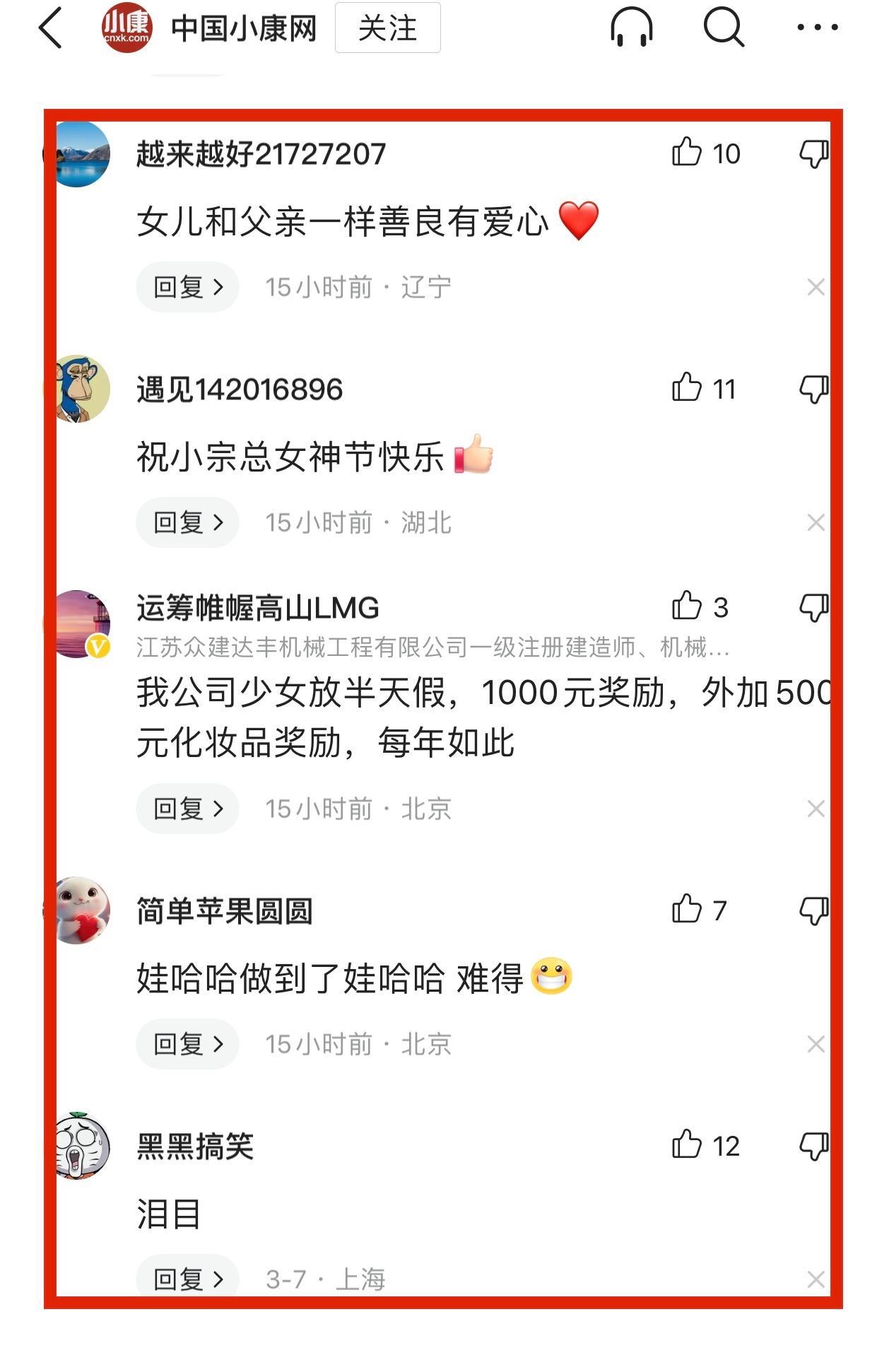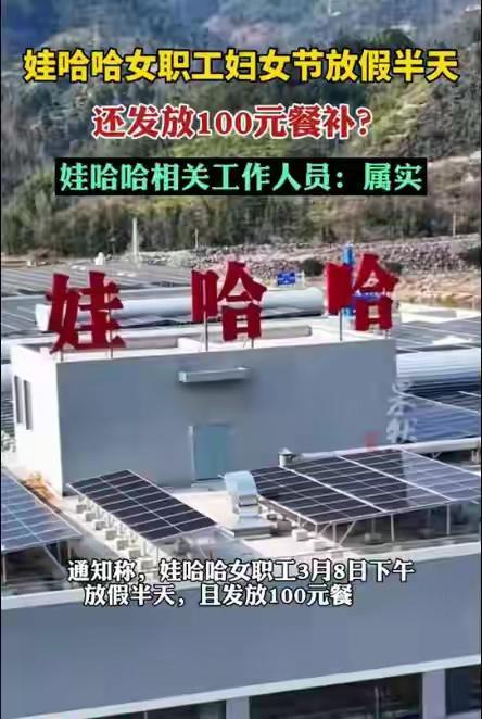 (四)、娃哈哈集團,3月4日官宣,3月8日婦女節當天,集團總補和分公司,給所有女員工放半天假,發100元餐費補貼,餐費打到女員工工餐卡。