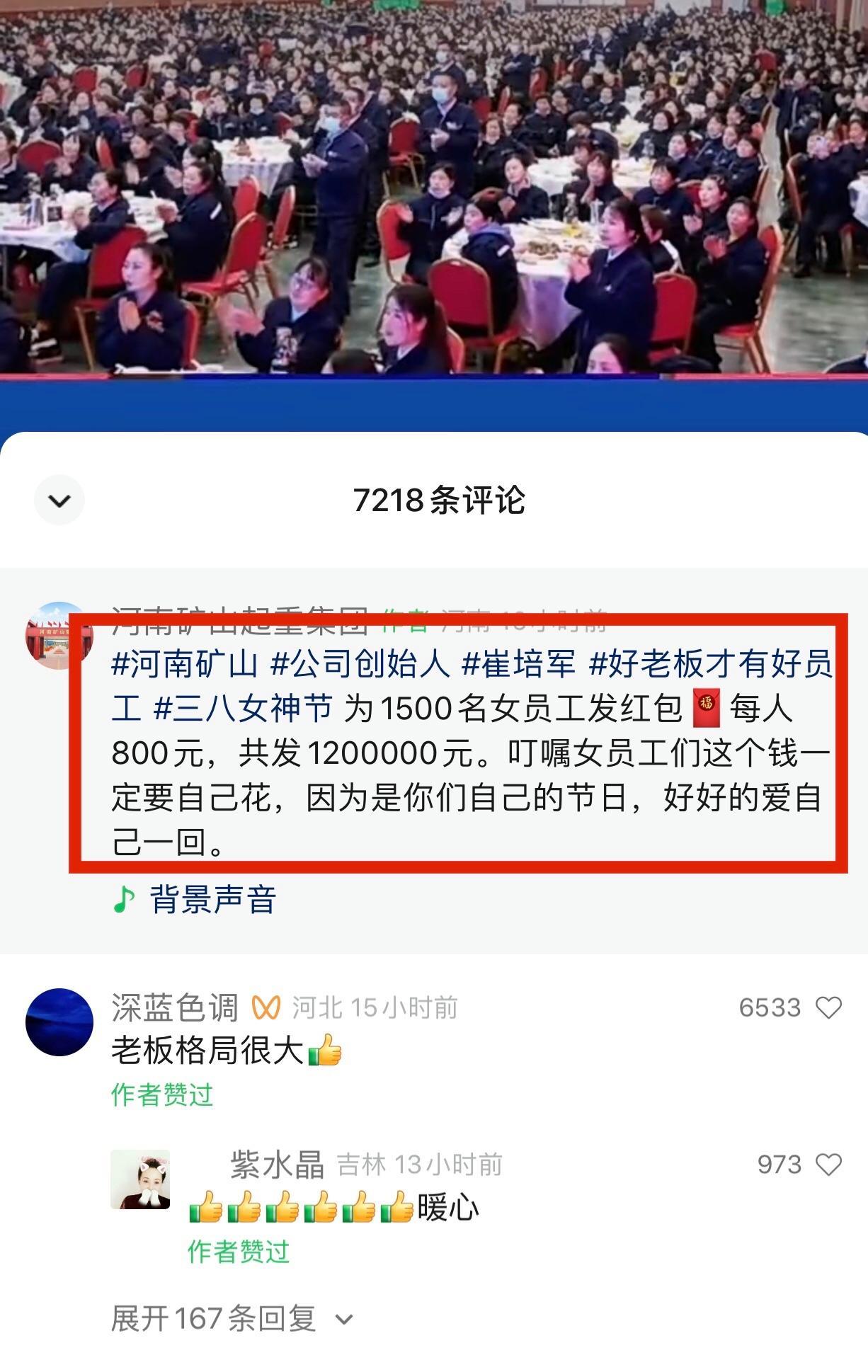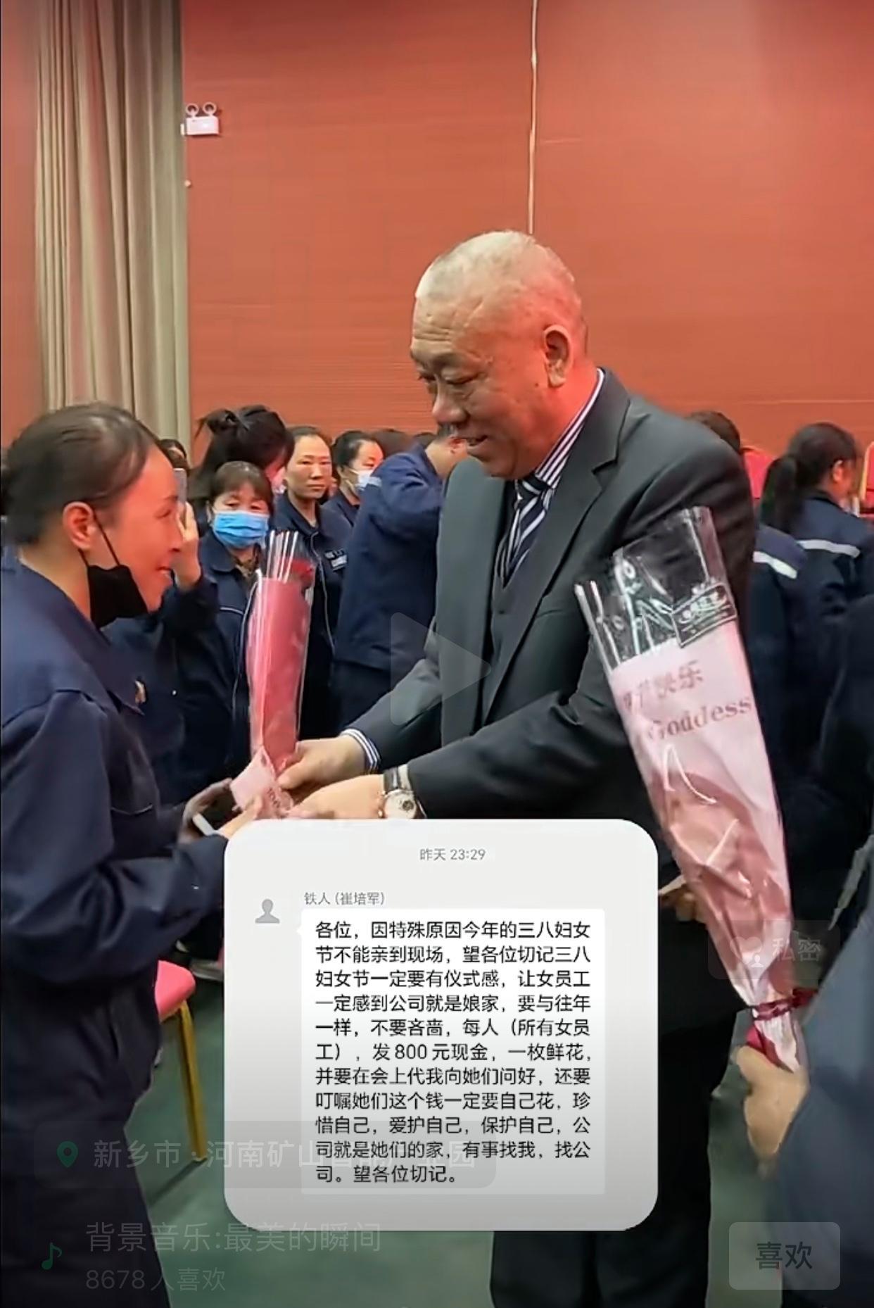 (二)、河南礦山起重機械公司,董事長崔培軍,公開宣佈,爲公司1500名女員工每人發800元紅包,外加一支玫瑰花,共發放1200000元,董事長特別叮囑每位女員工們拿到這個錢不要交給自己母親,也不要拿去做善事,一定要自己花,買自己喜歡的東西,因爲是你們自己的節日,好好的愛自己一回,這番接底氣話,並沒有大肆宣傳炒作,這是一個實實在在爲員工作想老闆,公司就是女員工孃家,遇到這樣公司老闆,誰不愛呢?