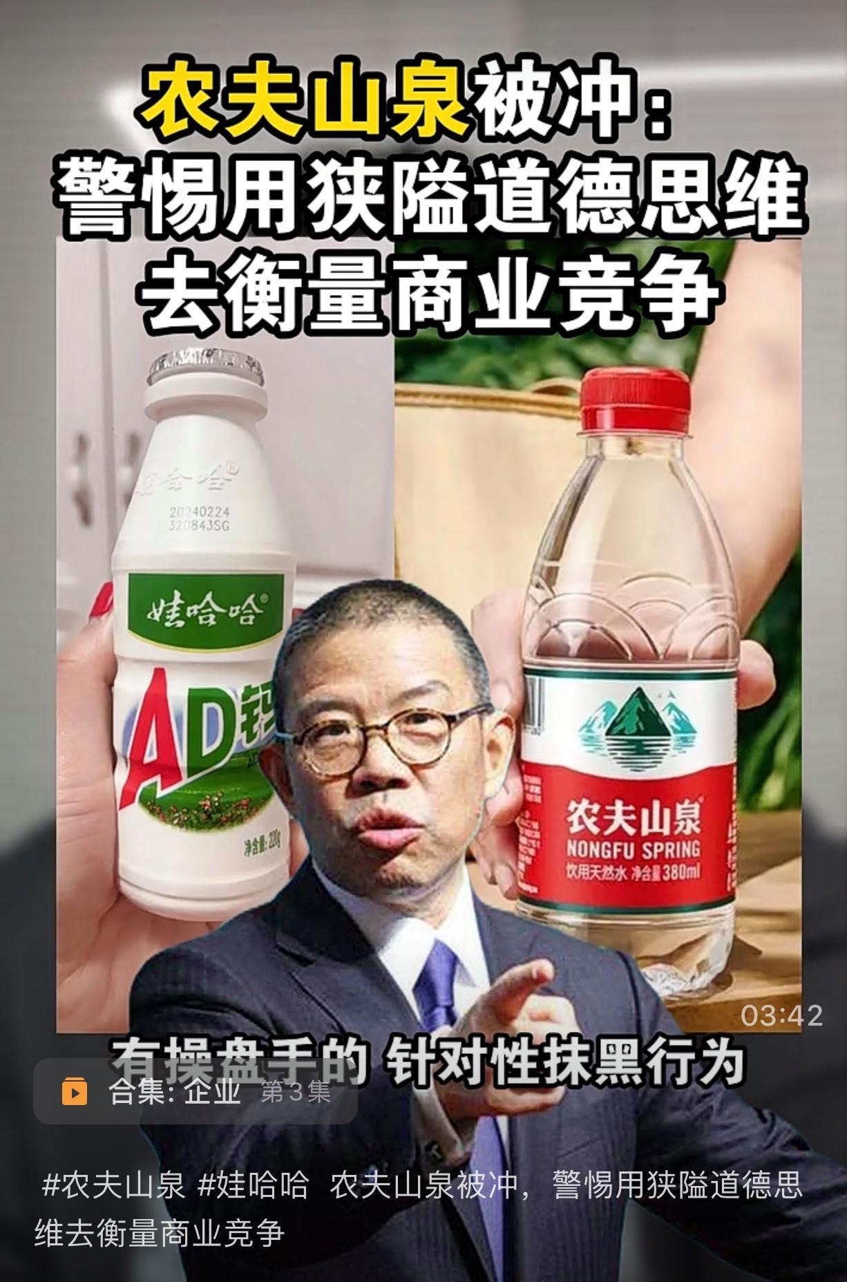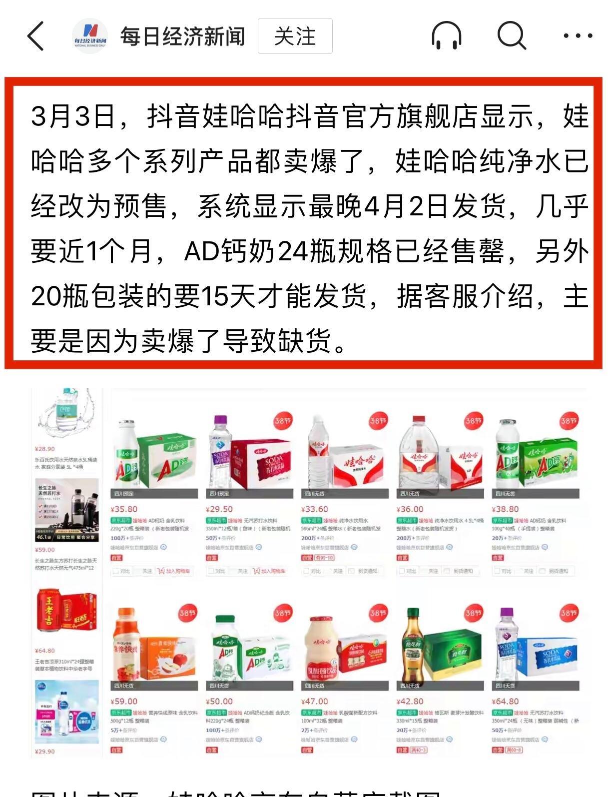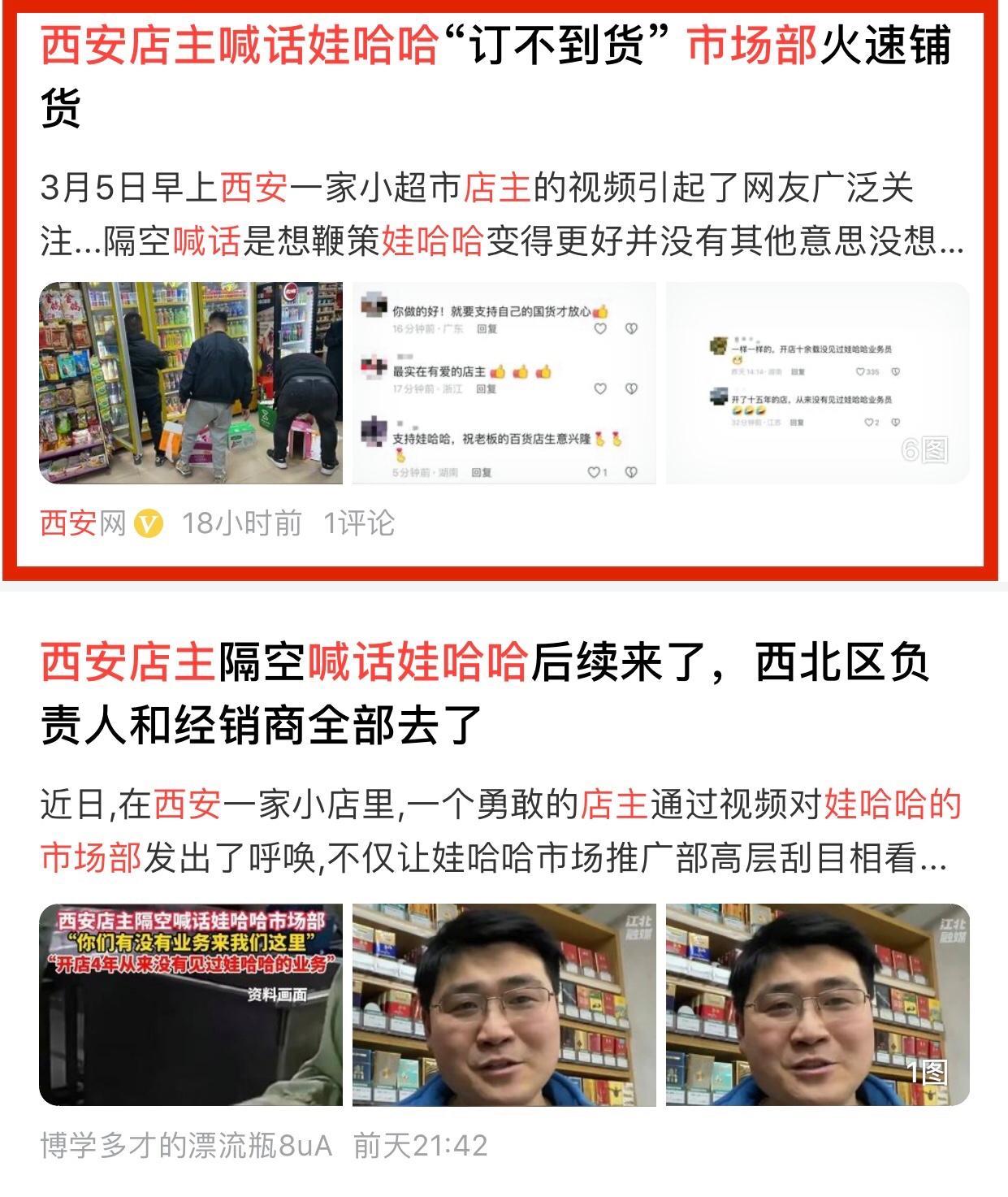 媒體報道,被網友怒批抵制的農夫山泉,一個是指責農夫山泉民族品牌背道而馳,哇哈哈股價連續三天跌停,網友說:哇哈哈纔是真正民族品牌,不上市,不割韭菜,致使現在目前情況就是從網上一些小賣部超市到個人言論視頻抵制農夫山泉,很多超市不得不受到網友的輿論壓力,逼迫下架農夫山泉,全力支持哇哈哈。哇哈哈賬號漲粉破400萬,各種飲料礦泉水賣斷貨,網上購買娃哈哈飲料和礦泉水需要預定發貨,西安一個小賣部隔空喊話要上架娃哈哈礦泉水飲料,如今已經安排上,娃哈哈這波潑天富貴算是贏麻了。