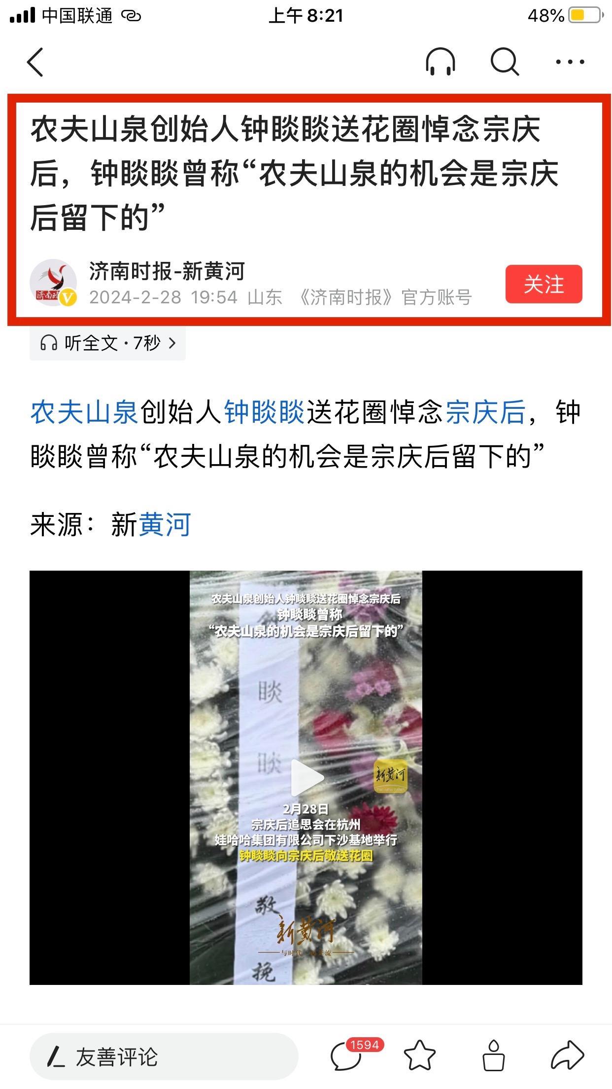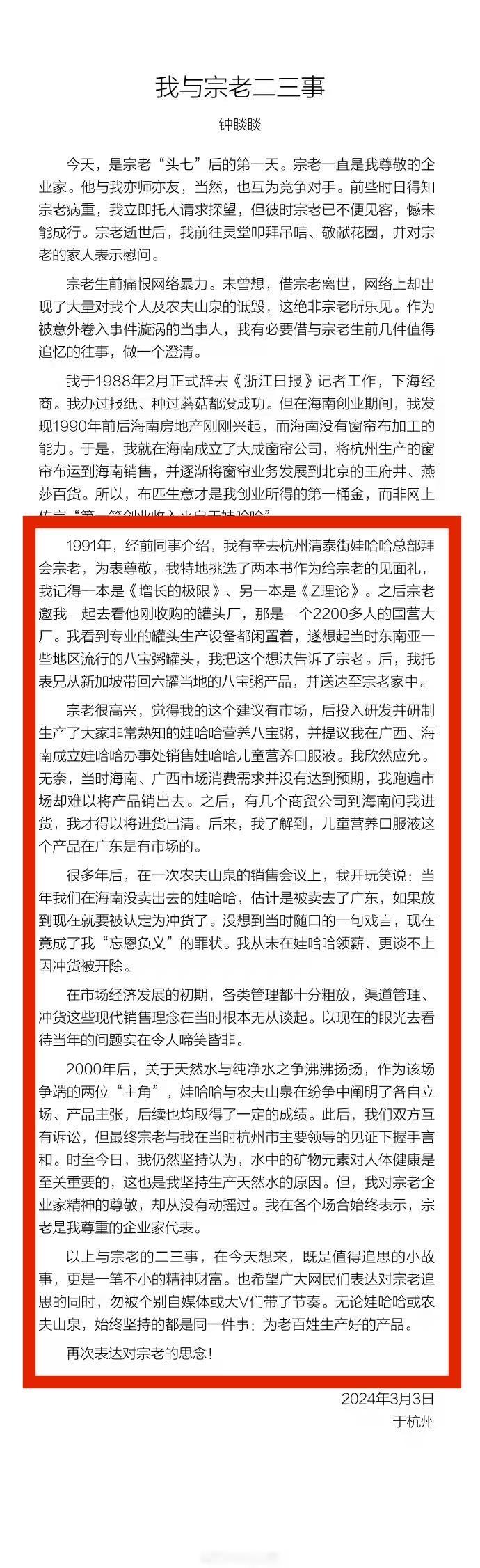 對於網友情緒高漲輿論壓力,農夫山泉董事長[gf]202d[/gf]鍾睒睒髮長文說明他與宗慶後往事,文中提了幾件事,他是比較尊敬宗慶後這位企業家,值得學習。
