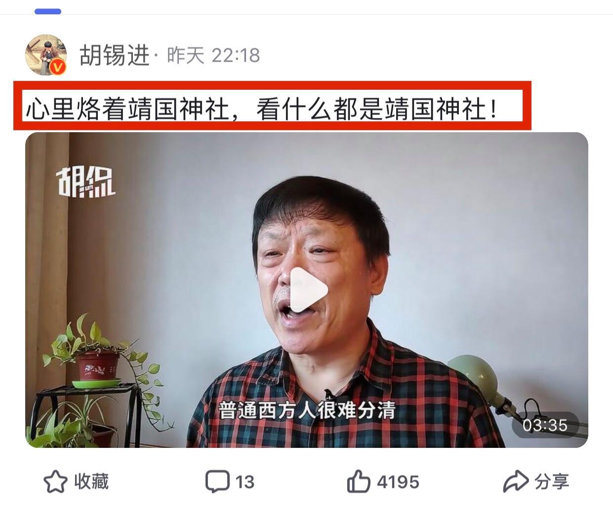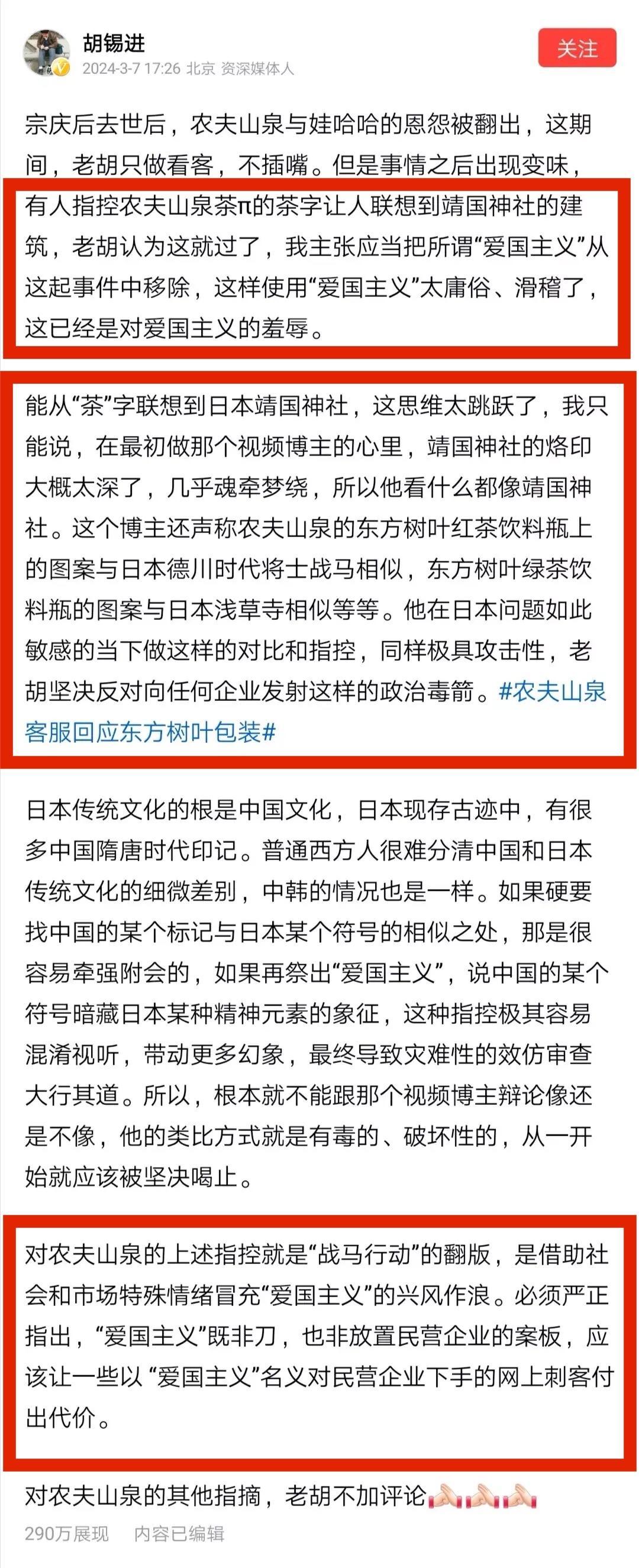 胡錫進自媒體大v,全網粉絲超5千萬,他對這件事情看法是自媒體博主帶節奏,過度解讀農夫山泉飲料上的標籤建築圖案,他說只要深陷這種輿論圈的人,看什麼都像島國圖案,都能聯想到一起,他說這位爆料農夫山泉自媒體博主如同爆料南京商城圖案戰馬行動是一回事,假借民族主義仇狠煽動情緒,胡錫進要求停止這場鬧劇,要求嚴懲帶節奏蹭流量博主。