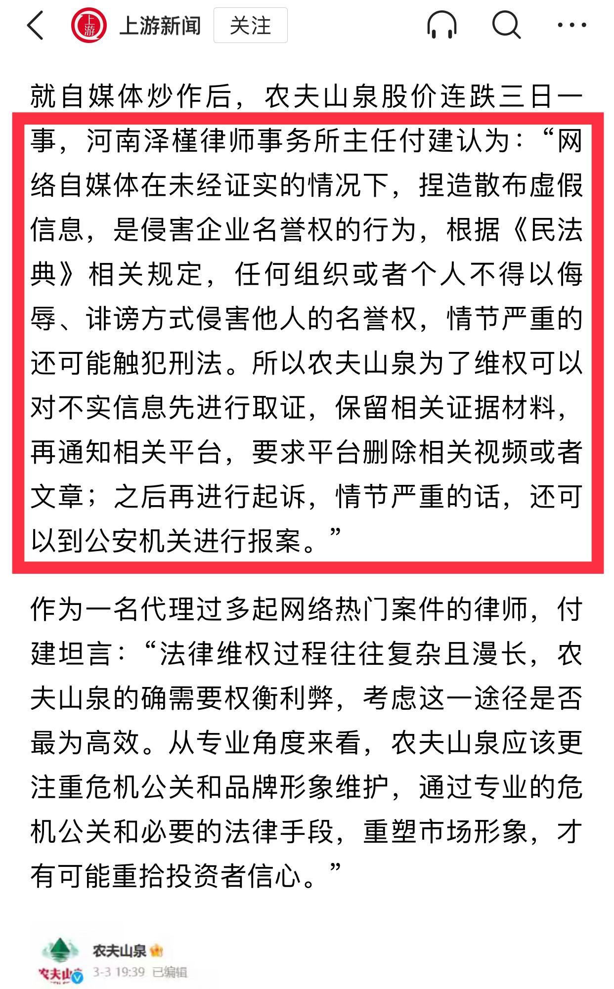 根據上游新聞一篇報道,採訪律師對農夫山泉事情看法,律師指出,如果自媒體沒有實錘證據,是會遭遇農夫山泉起訴的。