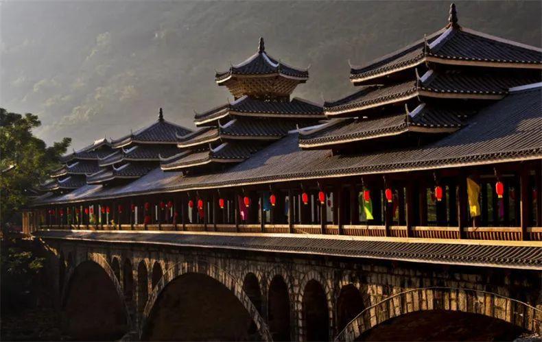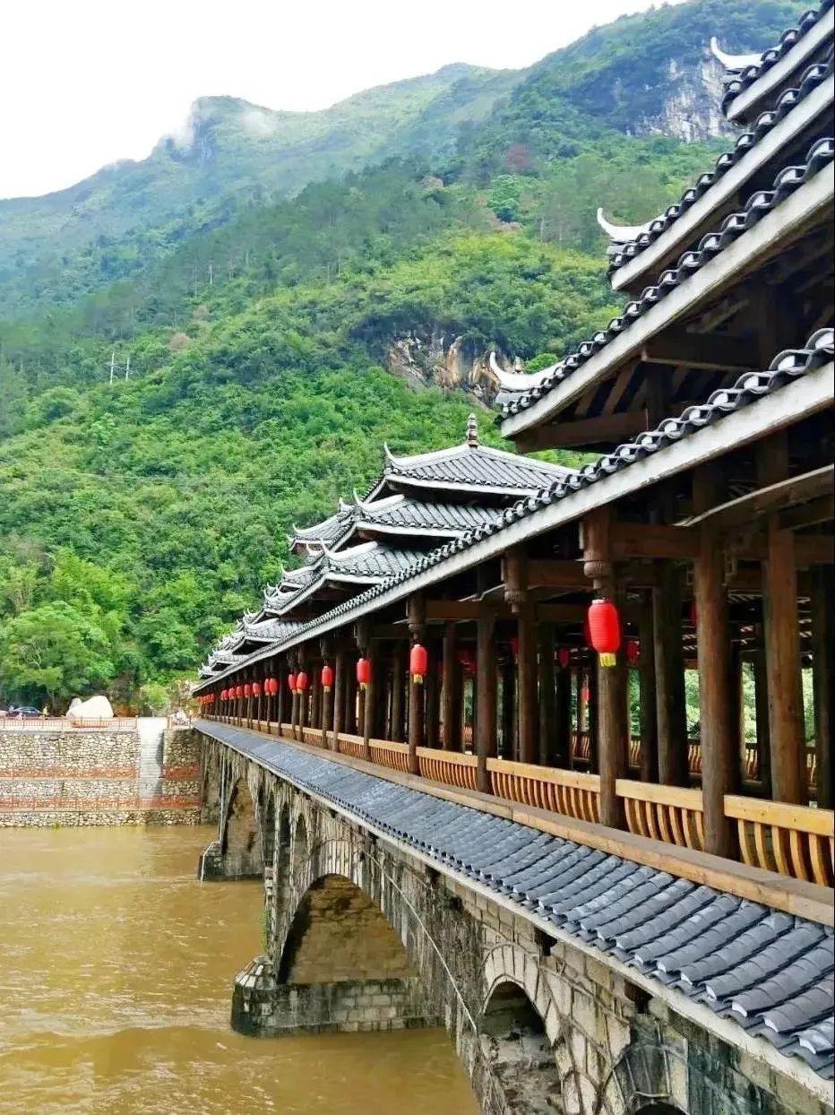 整座風雨橋整體沒有一釘一鉚,全以椎卯連接,橫跨兩江,屹立百年風雨至今仍在通行。