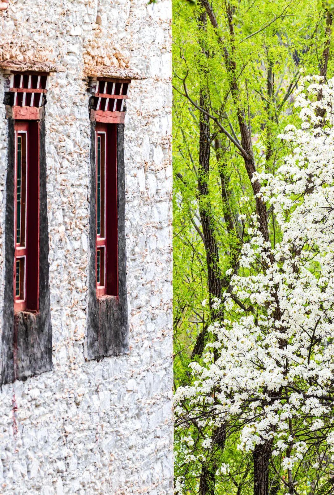 萬畝梨花點綴在山坡上,盛開在碉樓、藏寨間,絲毫不亞於國內的任何春色。