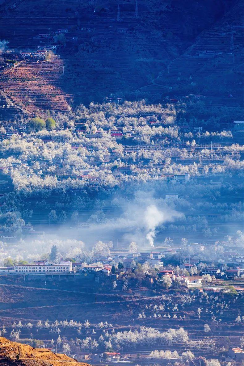 一夜之間金川兩岸萬畝梨花飛舞,千樹萬樹梨花盛開,綿延兩百公里的大金川河谷粉妝玉砌,如一江銀龍、雪浪翻飛。
