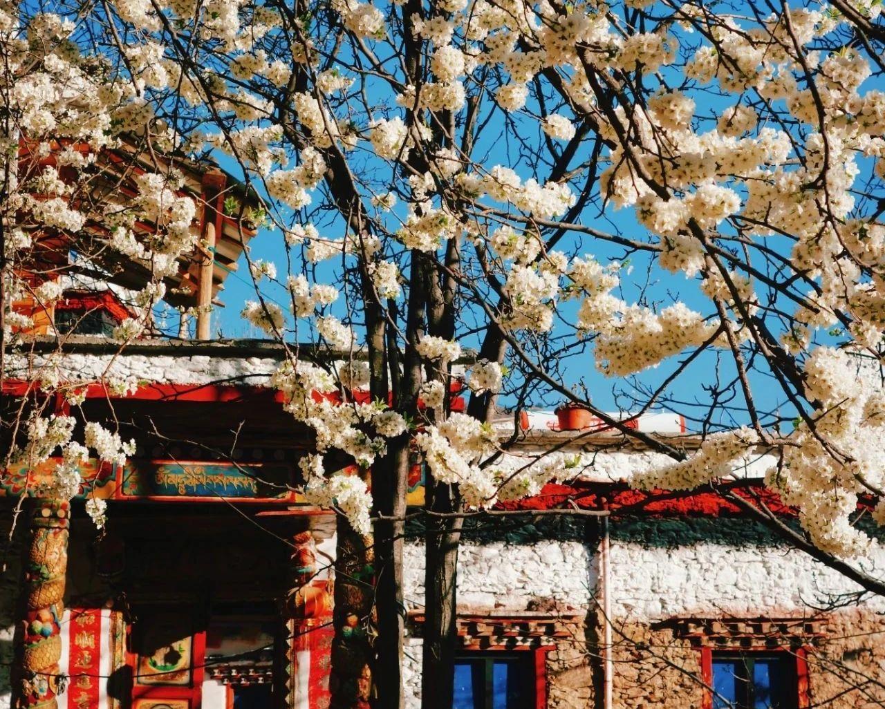 春天的藏寨,繁花盛開,紅、黃、綠、白各種色彩,梨樹、桃樹、杏樹,地裏種有青稞和油菜。