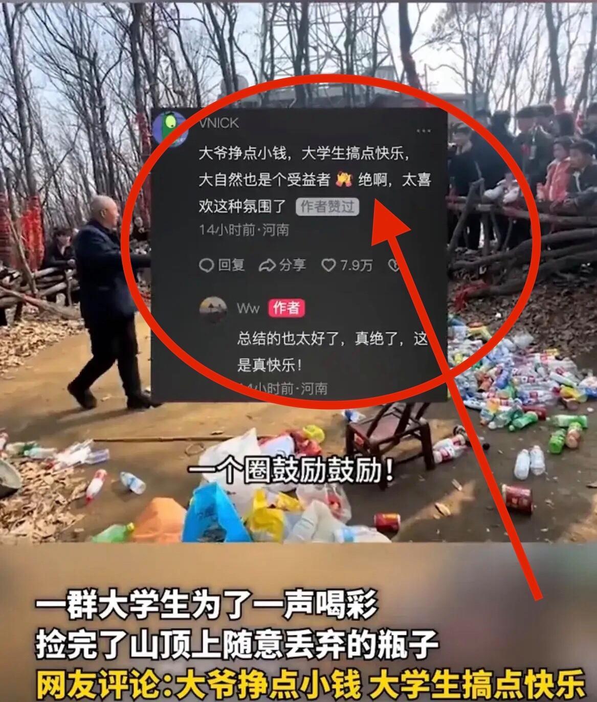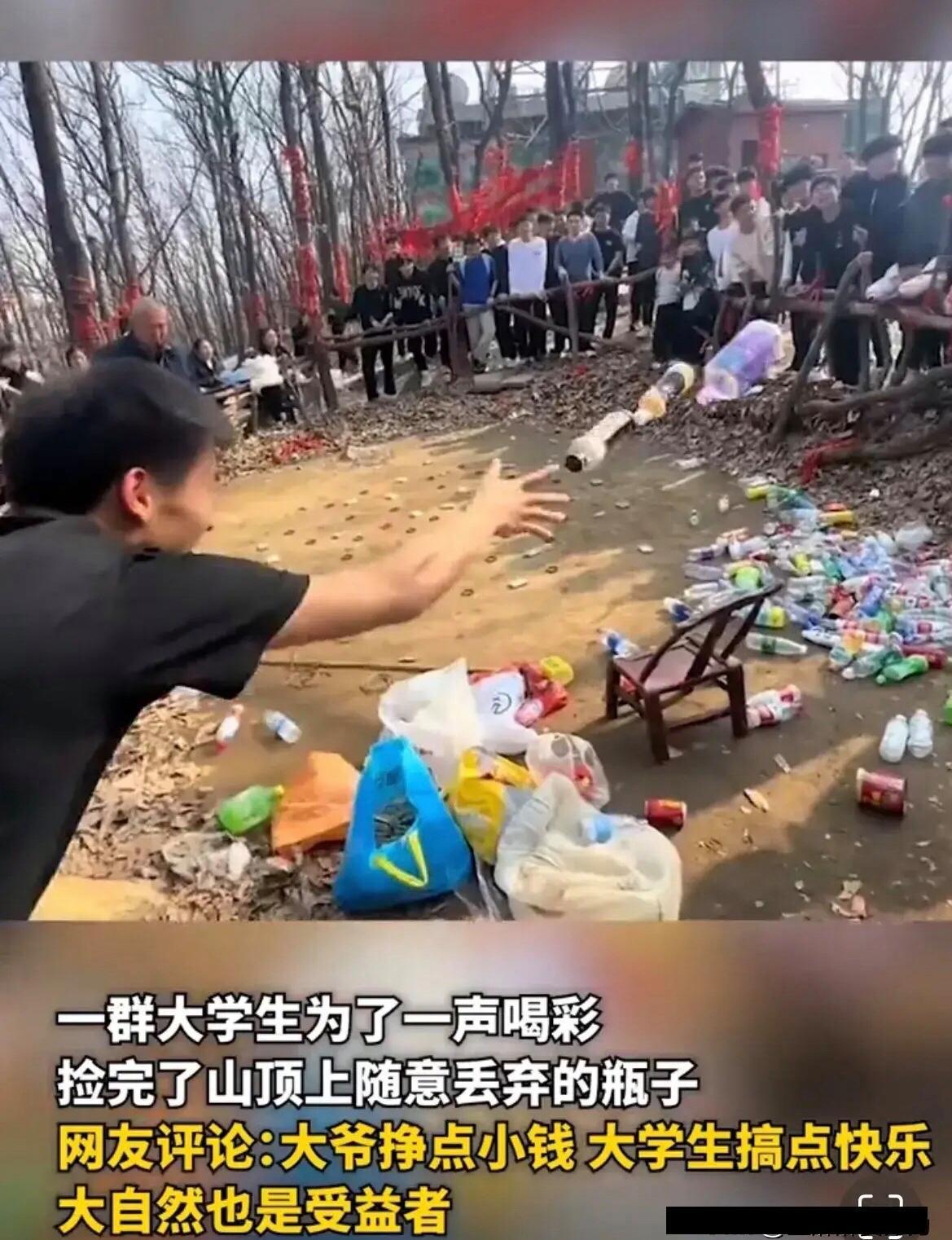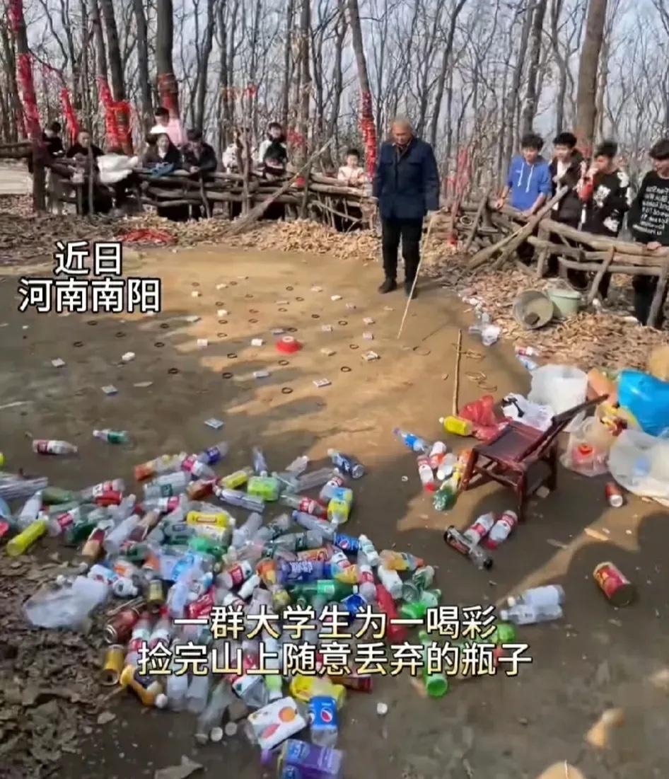 喬大爺不費吹灰之力就讓大學生和各路遊客把南陽獨山景區礦泉水瓶撿了個精光,網友評價大爺賺了個小錢,大學生遊客們圖個快樂,大自然環境得到了保護,三全其美的事情,這樣錦囊妙計,全國景區應該推廣學習。
