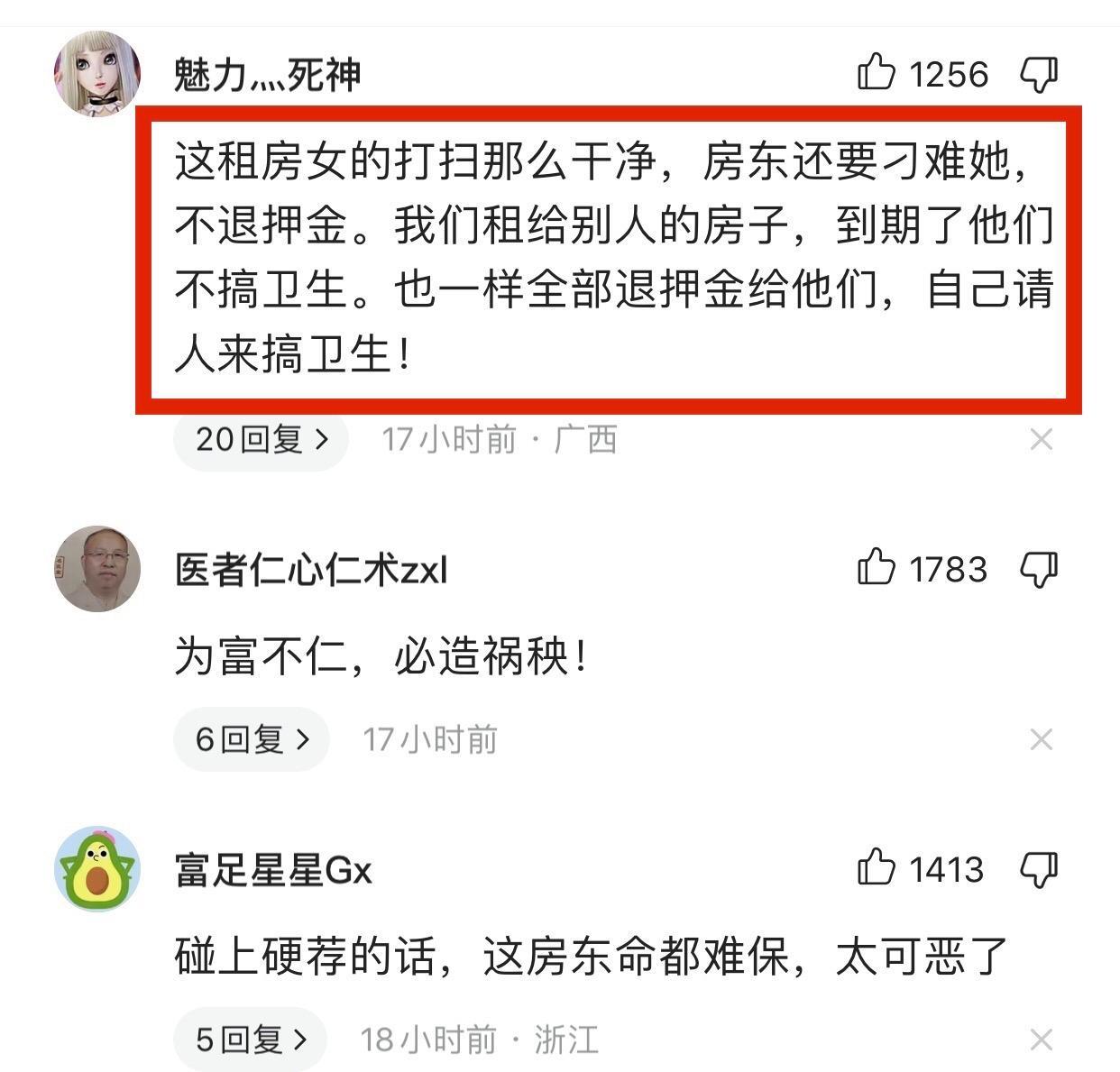 這個事情網友認爲母子二人純屬於無力刁難,蠻橫不講理,這次經過現場曝光之後,房東母子二人行爲實在令人反感,以後不知道她房子能不能租出去。
