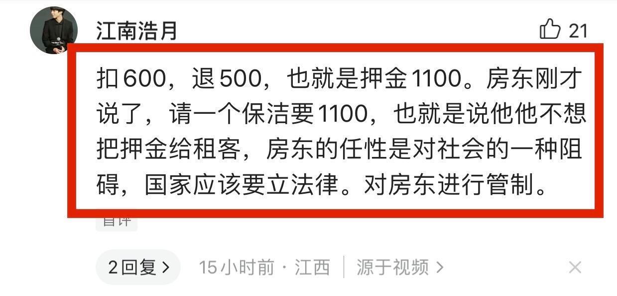 2、扣600,退500,也就是押金1100。房東剛纔說了,請一個保潔要1100,也就是說他他不想把押金給租客,房東的任性是對社會的一種阻礙,國家應該要立法律。對房東進行管制。