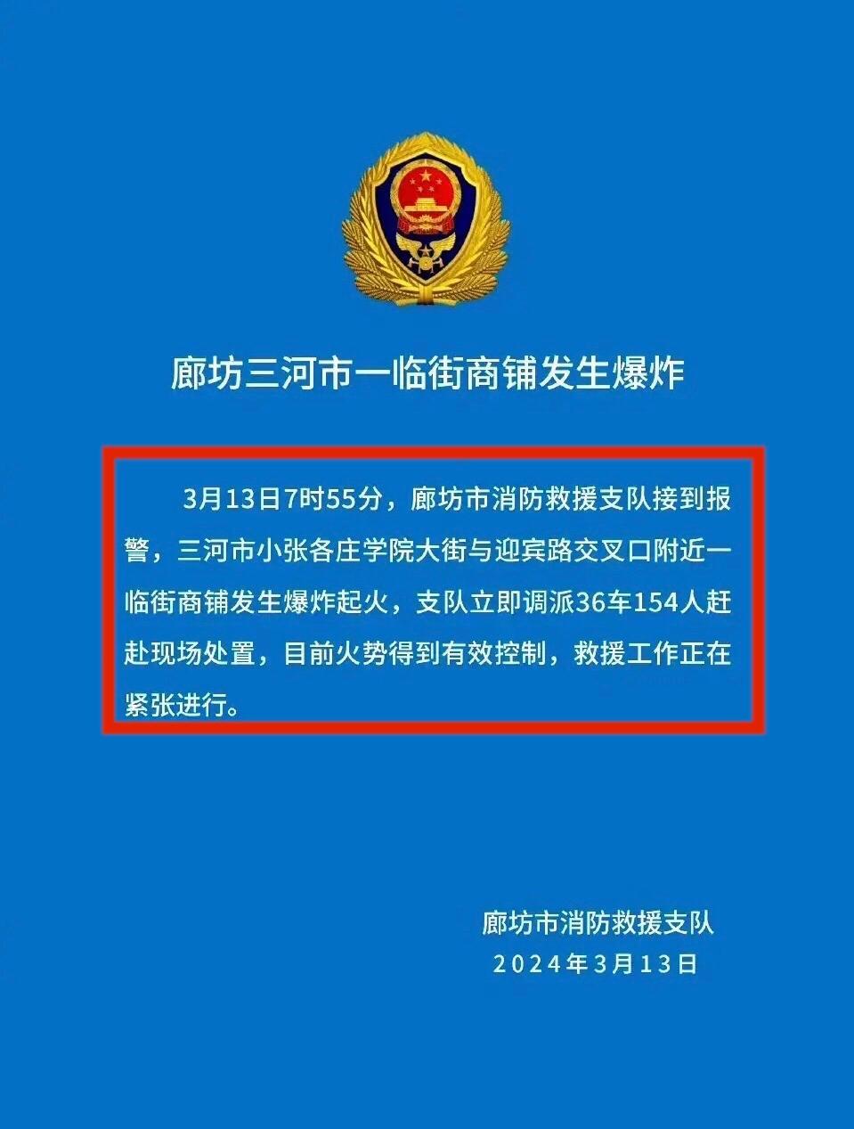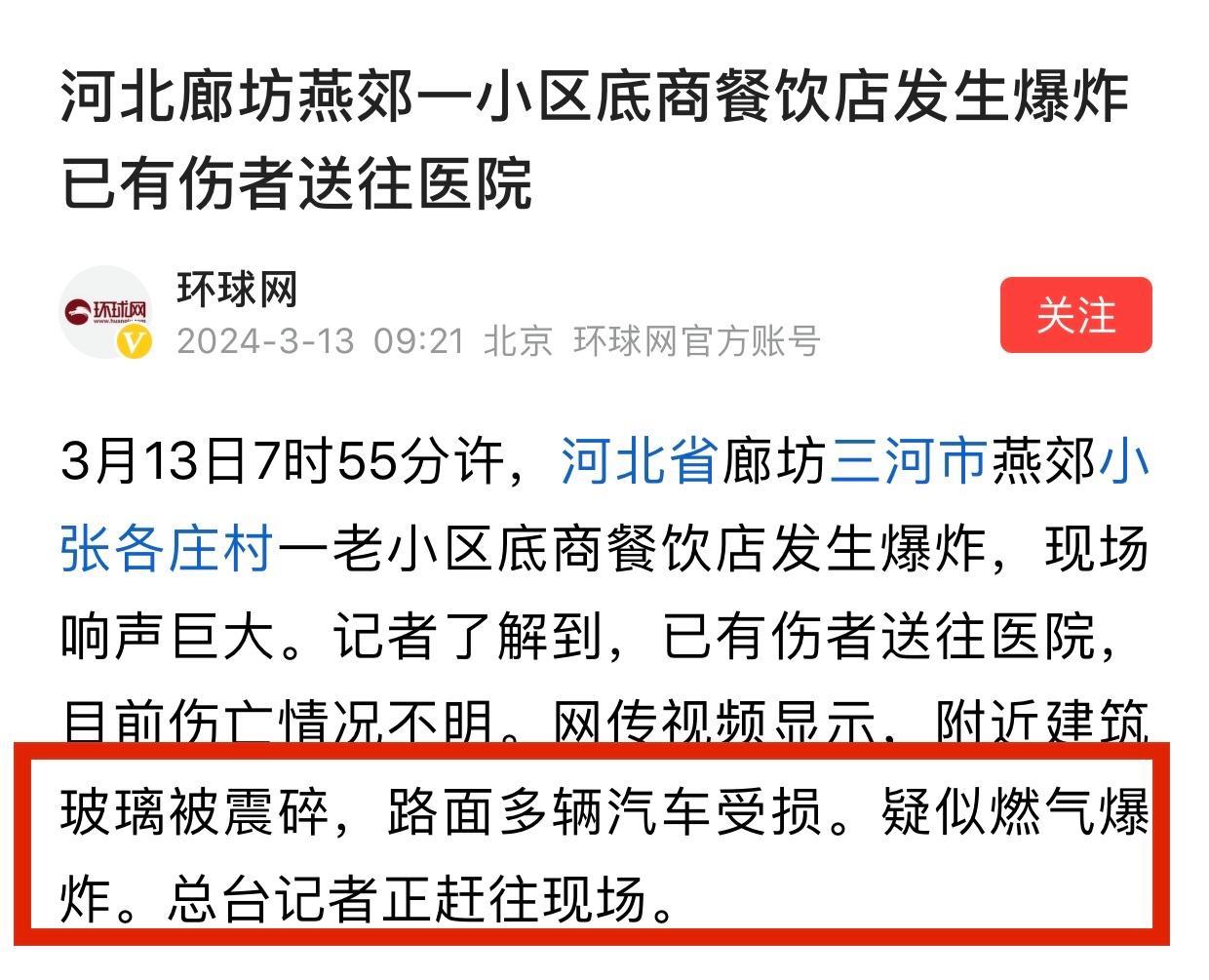 根據環球網消息:2024年3月13日,7時55分,事發地是河北省廊坊三河市燕郊小張各莊村一老小區底商餐飲店發生爆炸,現場響聲巨大。網傳視頻顯示,附近建築玻璃被震碎,路面多輛汽車受損,疑似燃氣爆炸。