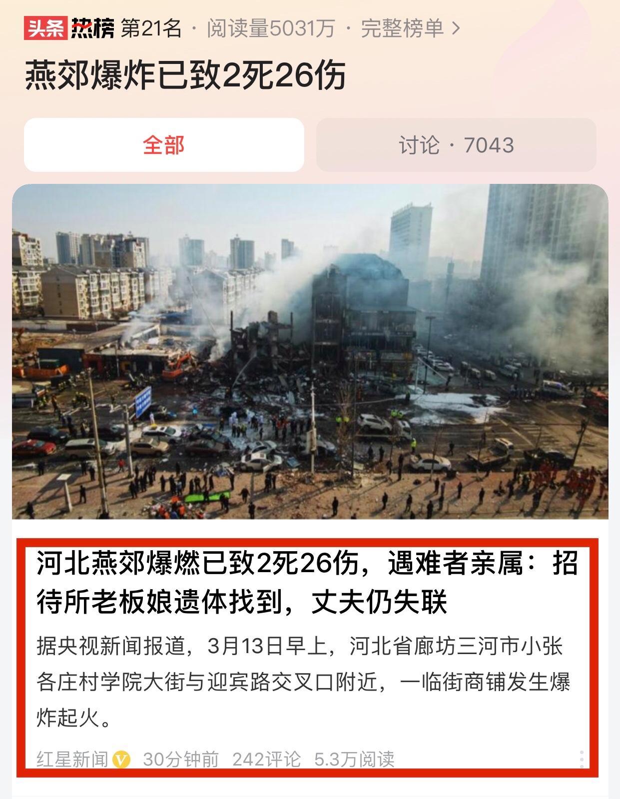 今天滿屏熱搜基本是燕郊爆炸的新聞,有新聞報道燕郊爆炸發生過兩次了,目前新聞報道傷亡數據是2死264人受傷,希望傷者早日康復,逝者安息。