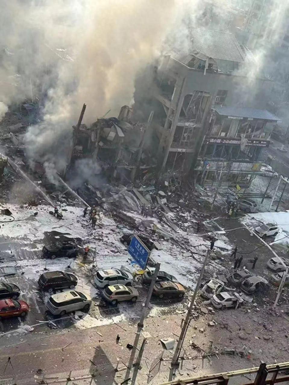 從新聞報道和微信羣轉發的情況來看,現場慘不忍睹,濃煙滾滾,熊熊大火,一棟樓基本快被炸平了,全是殘垣斷壁,周邊汽車也是被炸得面目全非,沿街商鋪也被炸得七零八落,真的跟新聞聯播裏報道俄羅斯跟烏克蘭戰爭沒兩樣。