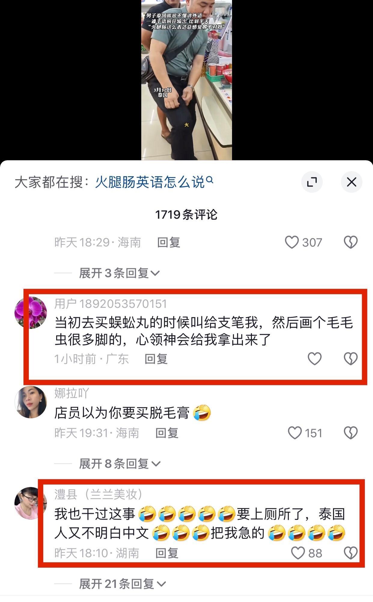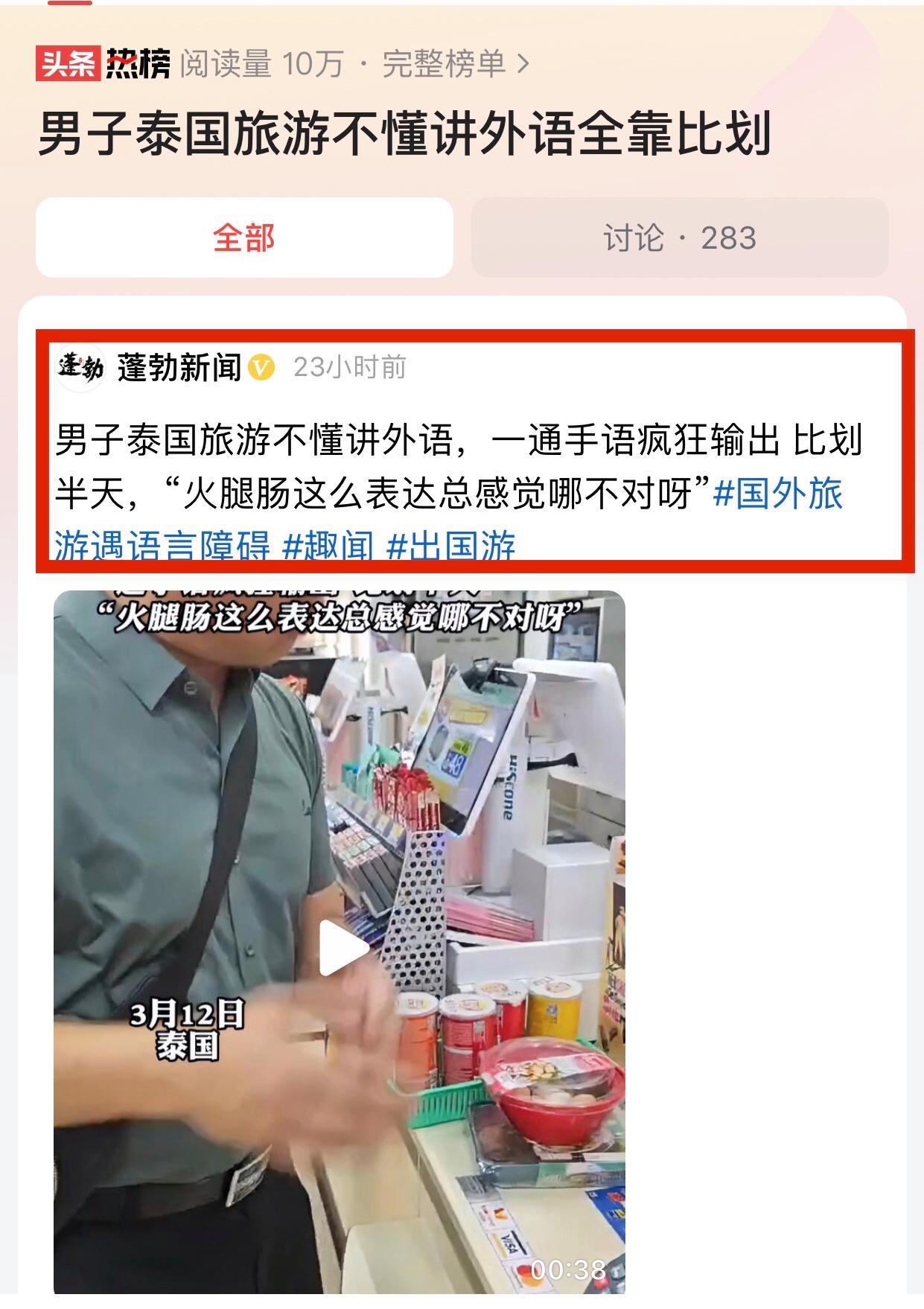最近一位中國男子到泰國旅遊,由於他不會英語,到超市買東西,他就像啞巴一樣進行手勢比劃,他比劃半天服務員也沒有明白他的意思,該男子把自己褲腳擼上來一通比劃,服務員以爲他要買什麼擦腿藥膏或者蚊蟲藥水,結果男子說不是,再次把腿露出來比劃,他說要買喫火腿腸,嘴巴一邊念火腿腸一邊拿腿比劃,最後服務人員和現場遊客笑噴,真是洋相出大了。