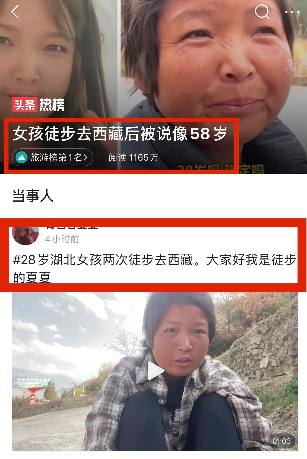 最近湖北武漢一位女揹包客徒步走紅,她自稱年齡28歲,有博主現場訪談她感覺不信,被紫外線曬傷的皮膚,一臉高原紅,頭髮乾燥夾雜一些白髮,如果不是她自己說出真實年齡28歲,加上曬出徒步以前一頭長髮飄飄的美少女,外人看來就是58歲,用10年前川藏線上一位騎行網紅形容自己去西藏前後顏值對比話說(當初裝叉去西藏,現在變成這般樣,連爹媽都不認識,誤以爲就是藏民)。