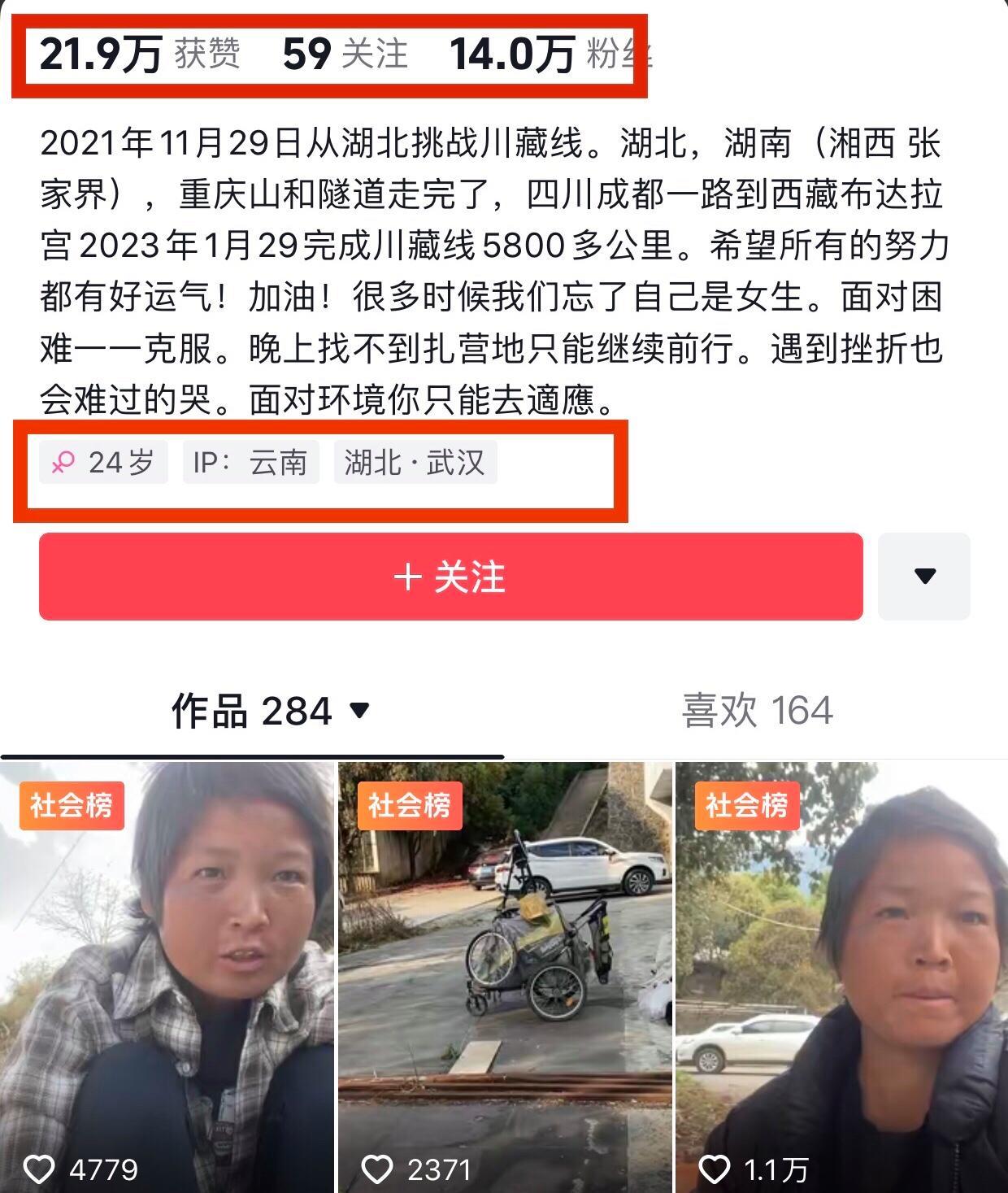 這位徒步女揹包客,在自己社交賬號上有14萬粉絲,地址顯示湖北武漢,目前在雲南,她在自己簡介裏寫到:2021年11月29日從湖北挑戰川藏線。湖北,湖南(湘西張家界),重慶山和隧道走完了,四川成都一路到西藏布達拉宮2023年1月29完成川藏線5800多公里,希望所有的努力都有好運氣!加油!很多時候我們忘了自己是女生,面對困難一一克服,晚上找不到紮營地只能繼續前行,遇到挫折也會難過得哭,面對環境你只能去適應。