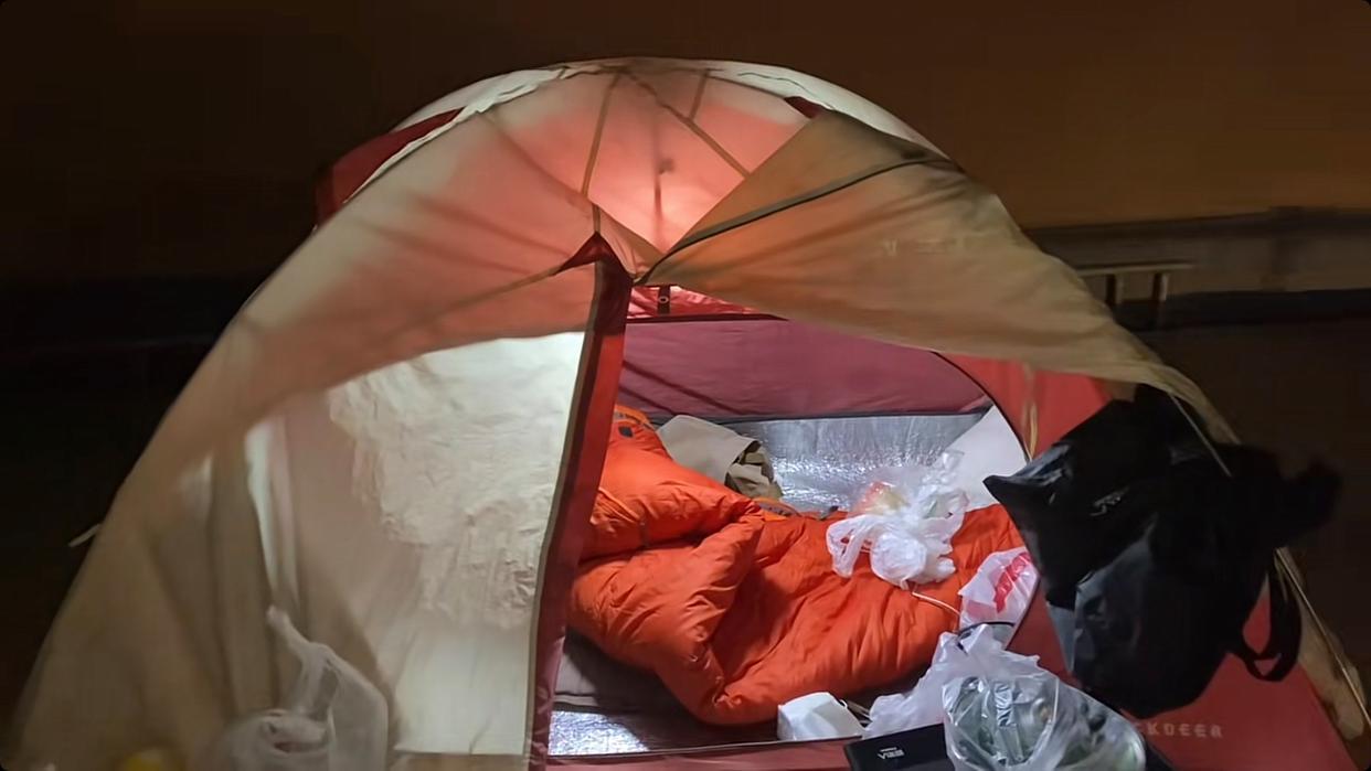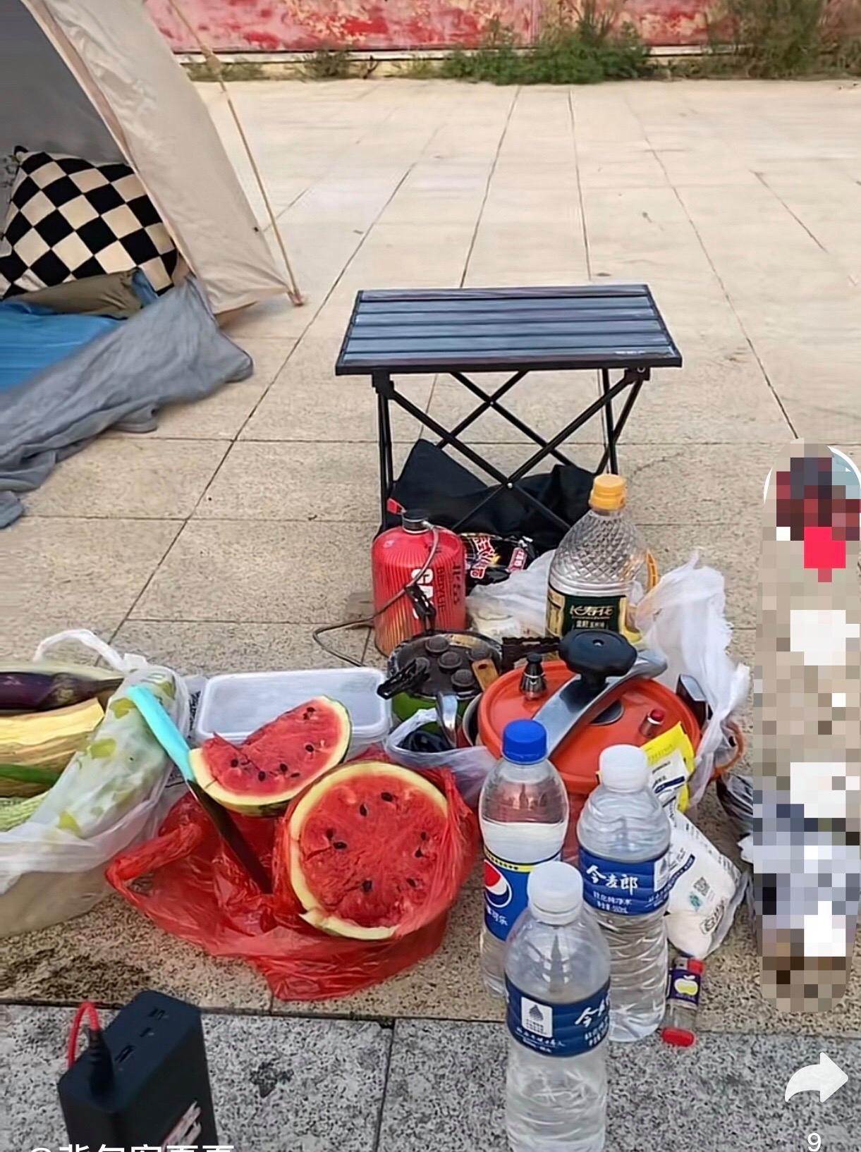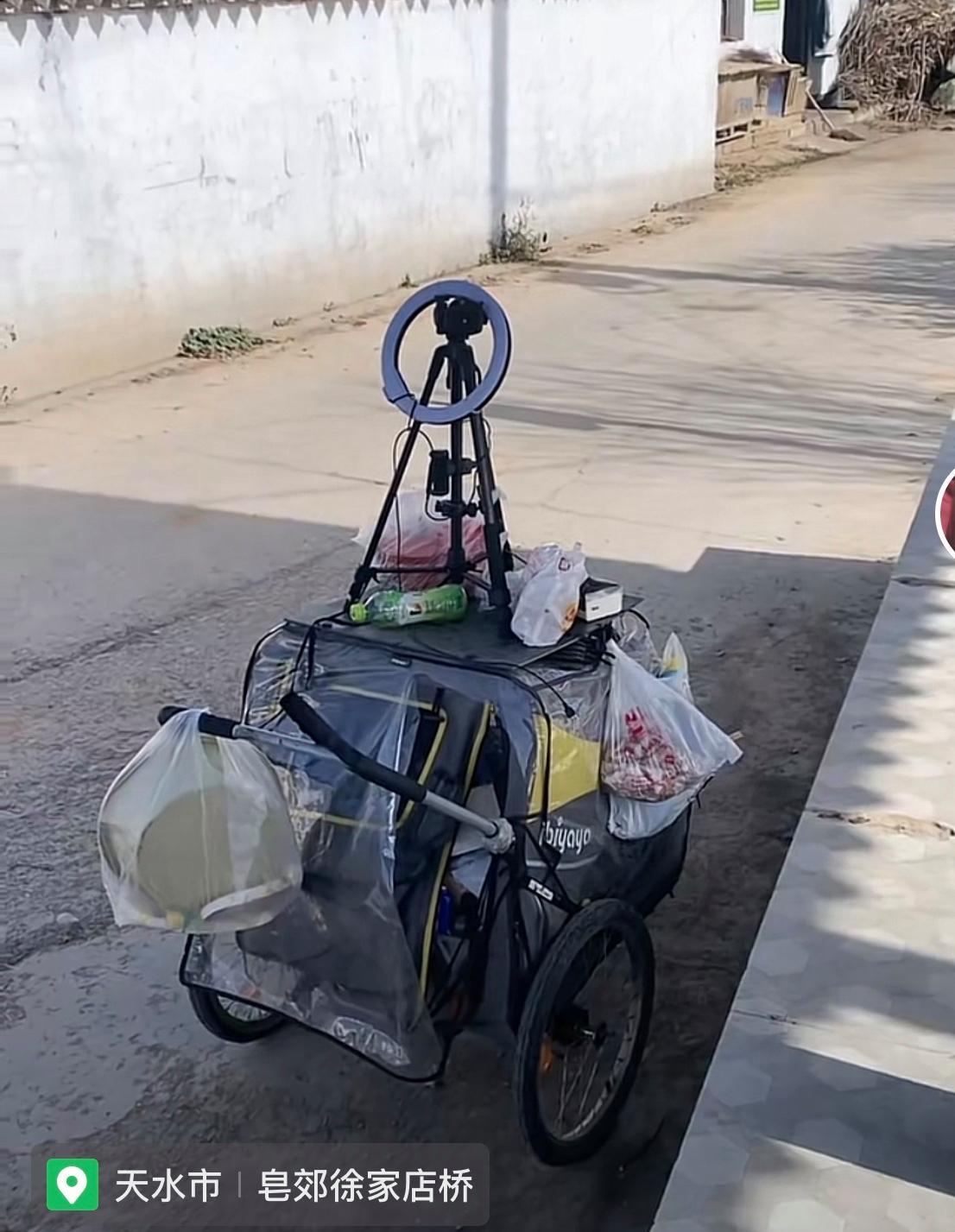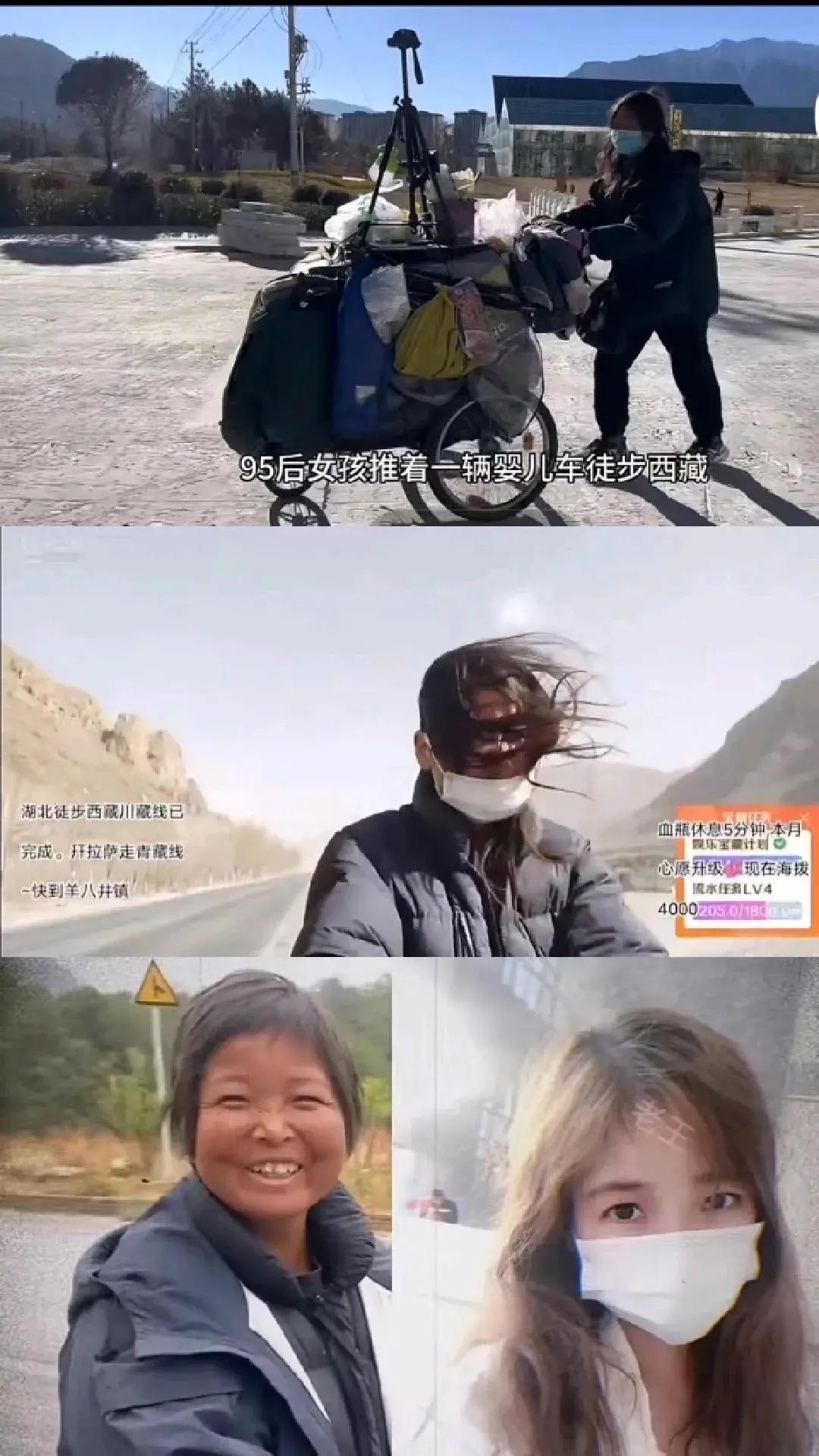 女揹包客推着一輛小推車,車上裝滿了她的行李,包含(帳篷、睡袋、做飯用的鍋碗瓢盆、充電寶、飲用水、直播腳架)就是一個移動的家,走到哪裏累了就哪裏搭帳篷休息,做飯、有一種日出二作,日落而息的感覺,一路風餐露宿,日曬雨淋、勞其筋骨、傷其體膚,有時候前不着村後不着店,找不到露營村子,就連夜徒步通宵,所以特別辛苦,也是導致外表衰老原因之一,有時候也會獨自默默流淚,所有困難都堅持了下來。