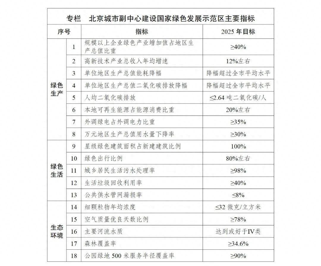 到2025年,北京城市副中心綠色發展內生動力明顯增強,綠色產業規模顯著提升,綠色技術創新和成果轉化體系基本建立,城市基礎設施綠色化水平進一步提高,生產生活方式綠色轉型成效顯著。單位地區生產總值能耗和單位地區生產總值二氧化碳排放達到全國領先水平,本地可再生能源佔能源消費比重達到20%左右,森林覆蓋率達到34.6%,空氣質量優良天數比例達78%以上,綠色發展優勢得到有力彰顯。