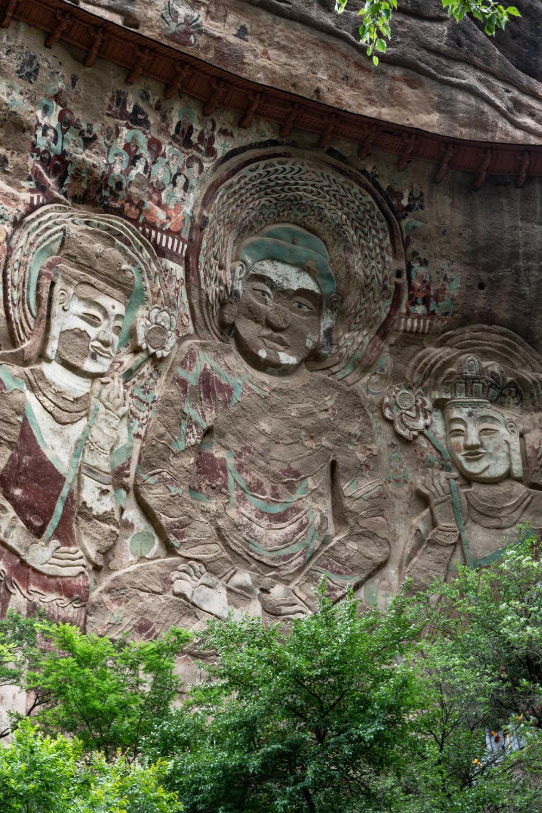 麥積山石窟窟龕有221個,各類雕塑3938件,壁畫千餘平方米。佛教造像造型質樸,且多展露出會心的微笑,處處彰顯着獨具韻味的東方之美。
