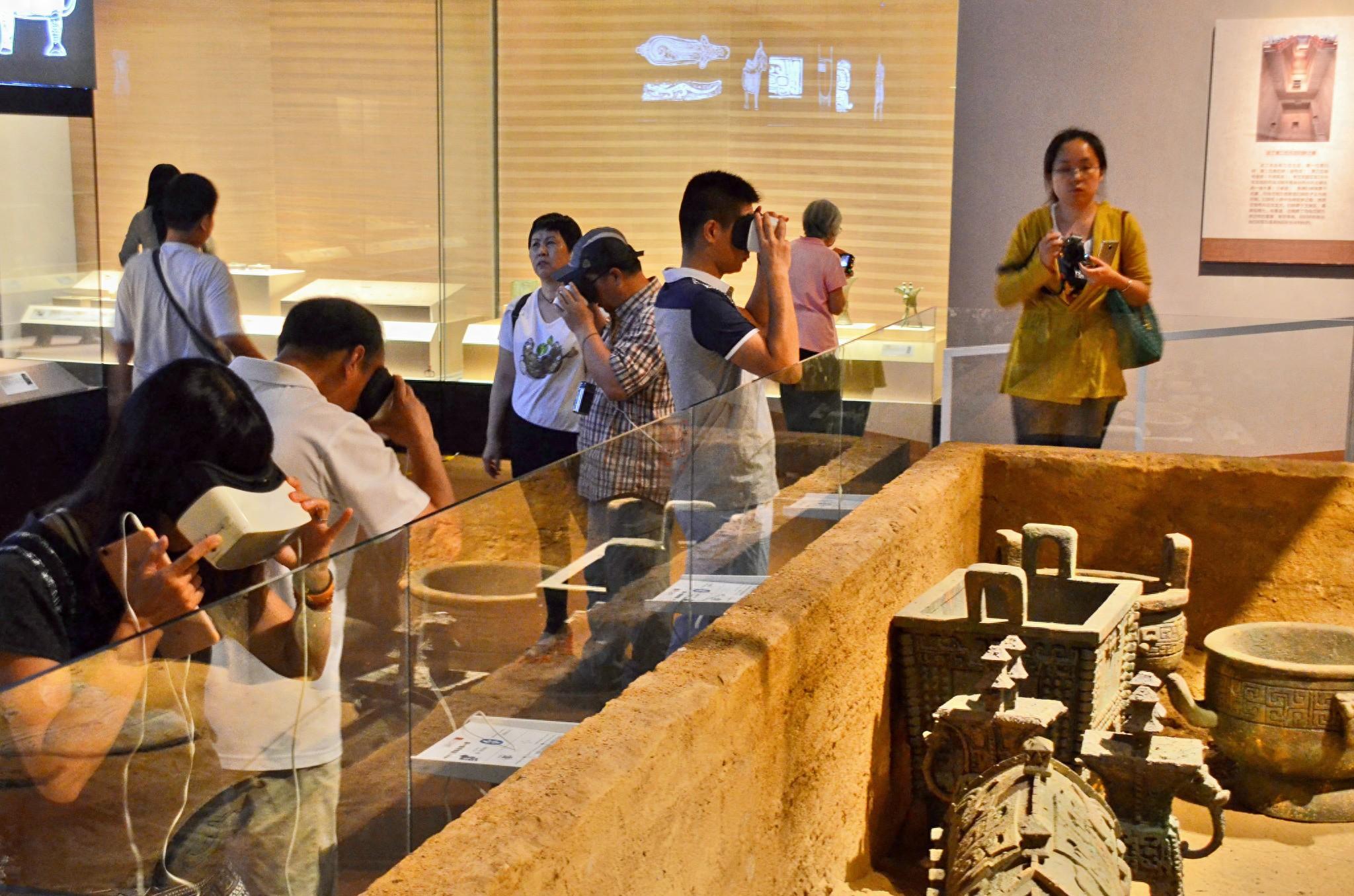 遊客在首都博物館舉辦的展覽上通過VR眼鏡瞭解展品信息