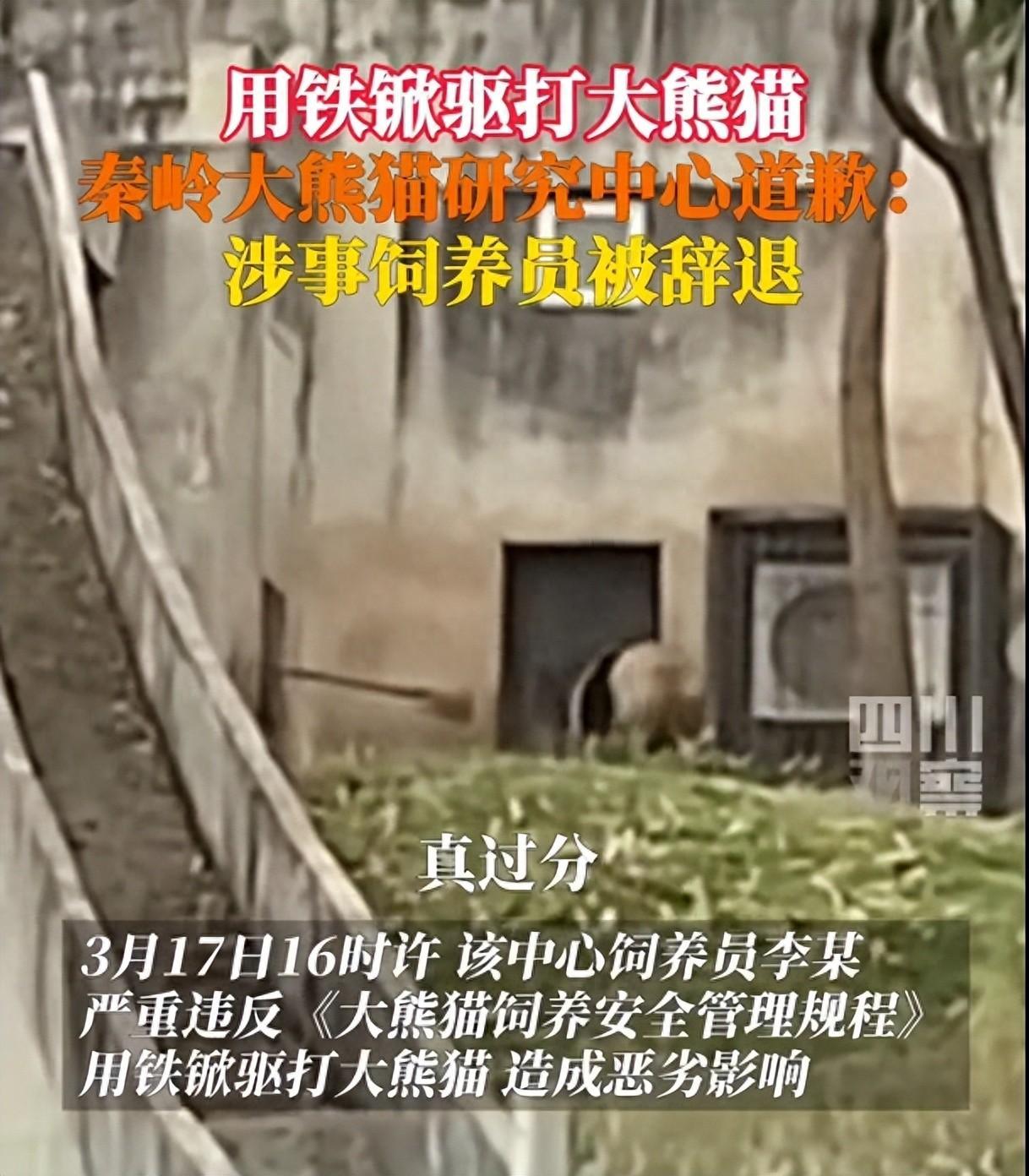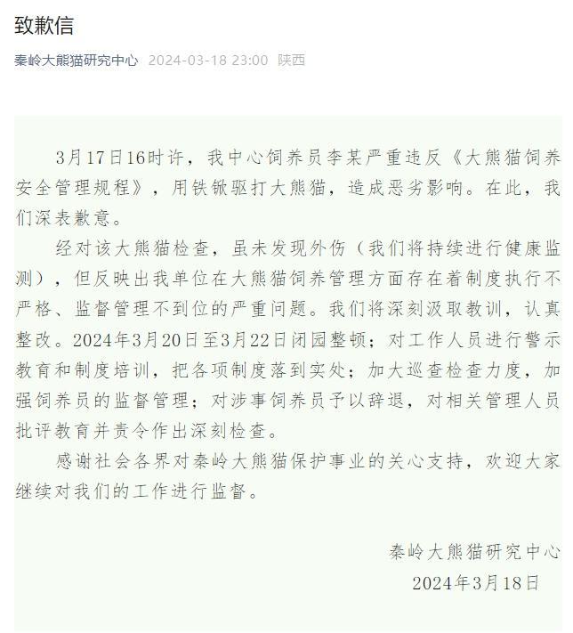 3月18日晚,秦嶺大熊貓研究中心發佈致歉信稱,3月17日16時許,該中心飼養員李某嚴重違反《大熊貓飼養安全管理規程》,用鐵鍁驅打大熊貓,造成惡劣影響。在此,秦嶺大熊貓研究中心深表歉意。