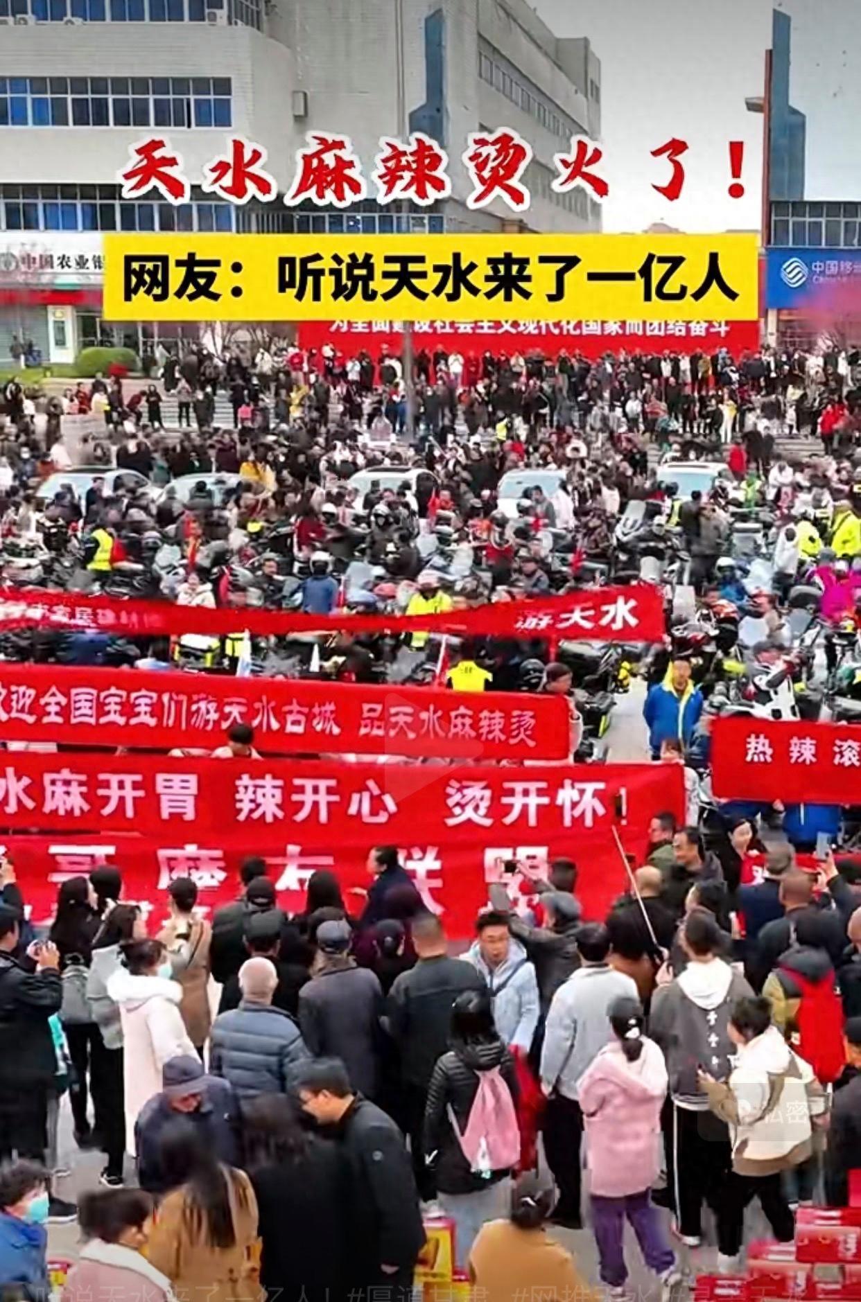 天水本地媒體發佈消息稱:截至3月14日,天水近一週旅遊搜索熱度上漲186%,目前關於“天水麻辣燙”話題在所有平臺播放量達到了32億多次,並呈現繼續快速上漲趨勢。最近一個週末(3月16—17日),天水的旅遊消費(含酒店民宿、景點門票、交通等)提前預訂量同比增長約18倍,遠遠高於全國大盤,天水每天有來自全國遊客近7萬人次,爲了應對來自全國旅遊大軍,天水傳統麻辣燙店已經滿足不了接待需求,着力新打造麻辣燙一條街。