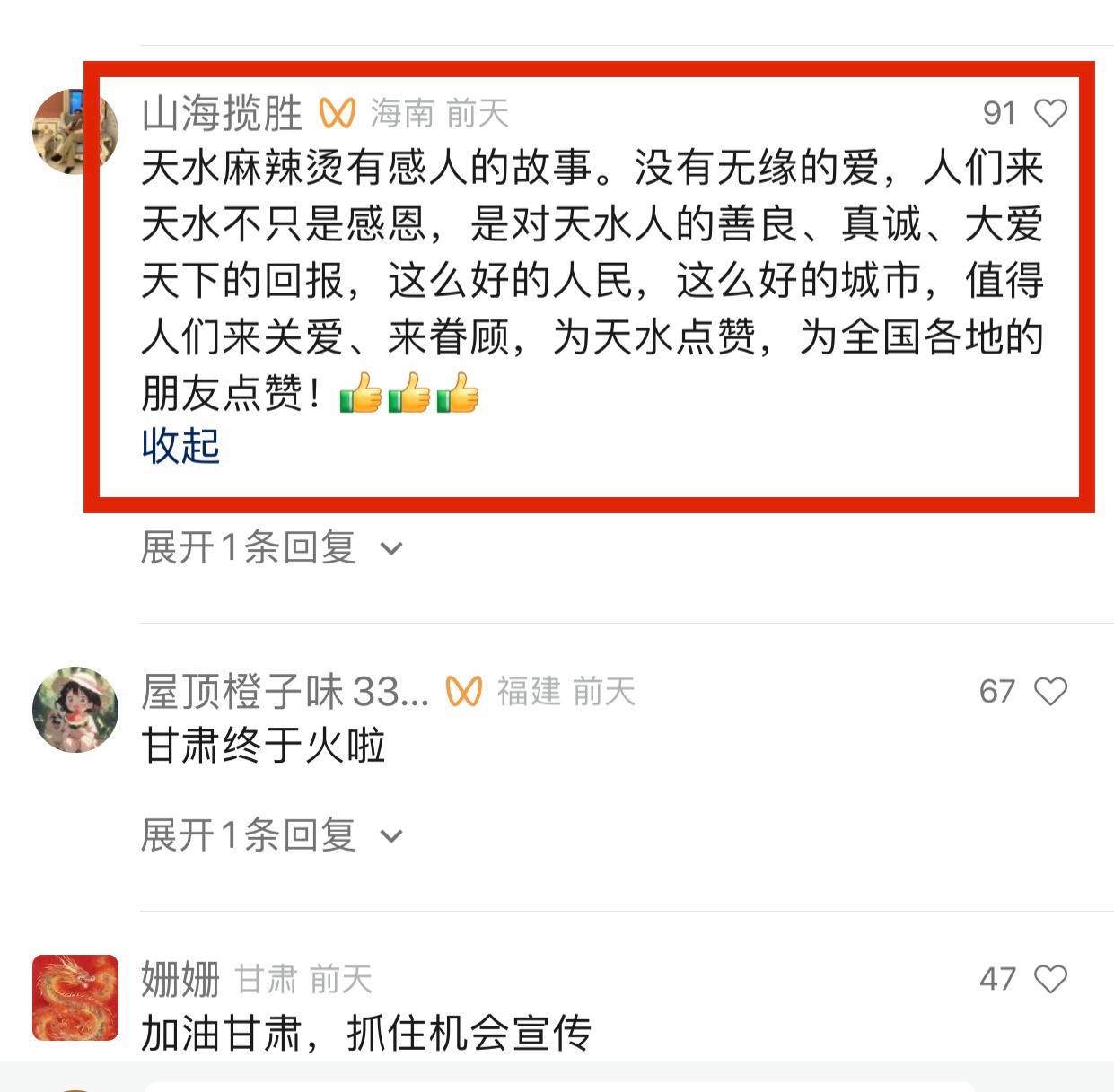 2、天水麻辣燙有感人的故事。沒有無緣的愛,人們來天水不只是感恩,是對天水人的善良、真誠、大愛天下的回報,這麼好的人民,這麼好的城市,值得人們來關愛、來眷顧,爲天水點贊,爲全國各地的朋友點贊!