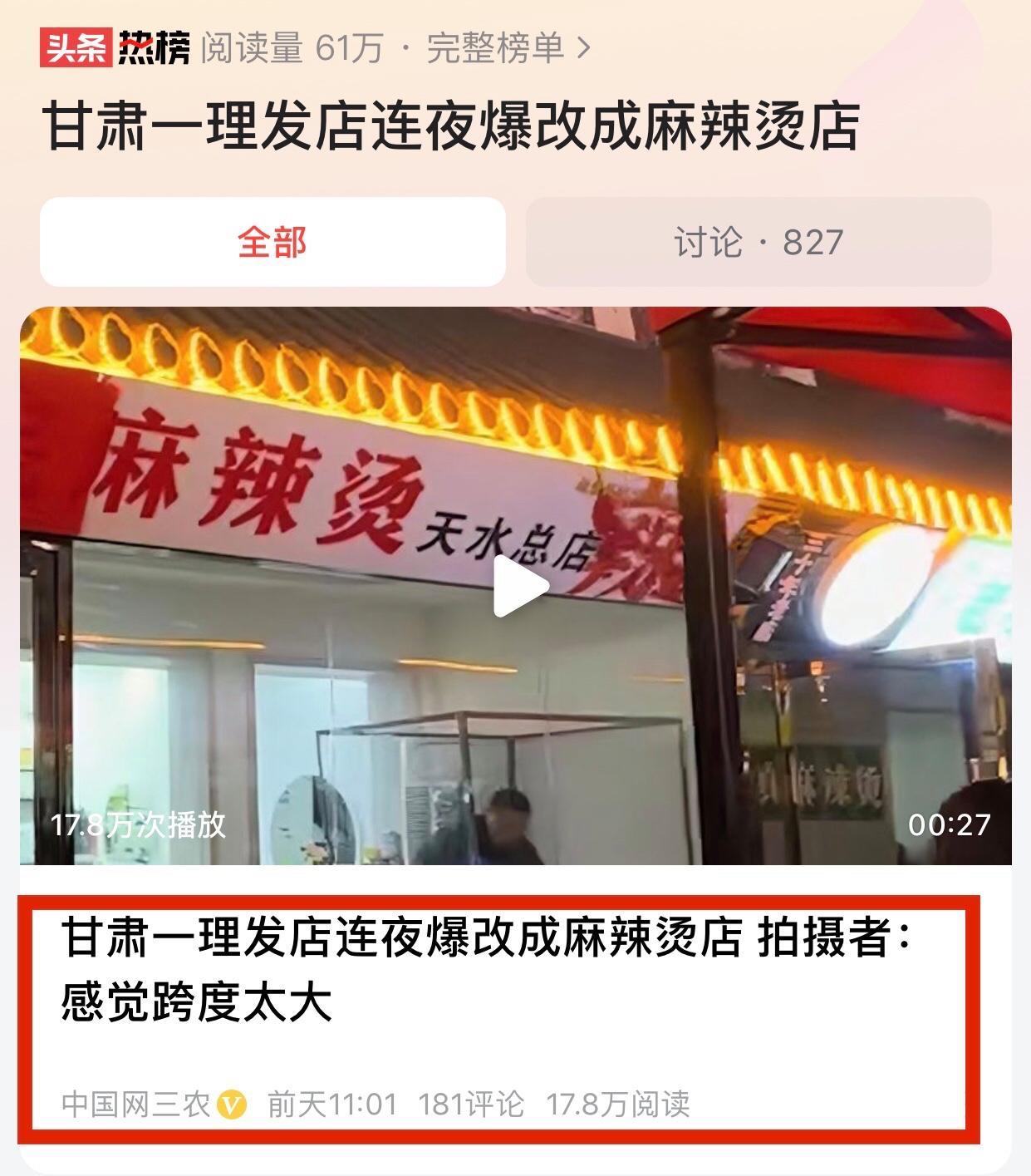 天水麻辣燙太火了,有點淄博那段時間高潮應對不過來億萬遊客大軍需求,很多平時不做麻辣燙的人也改行做麻辣燙,天水一家理髮店因爲改成麻辣燙店衝上熱搜。