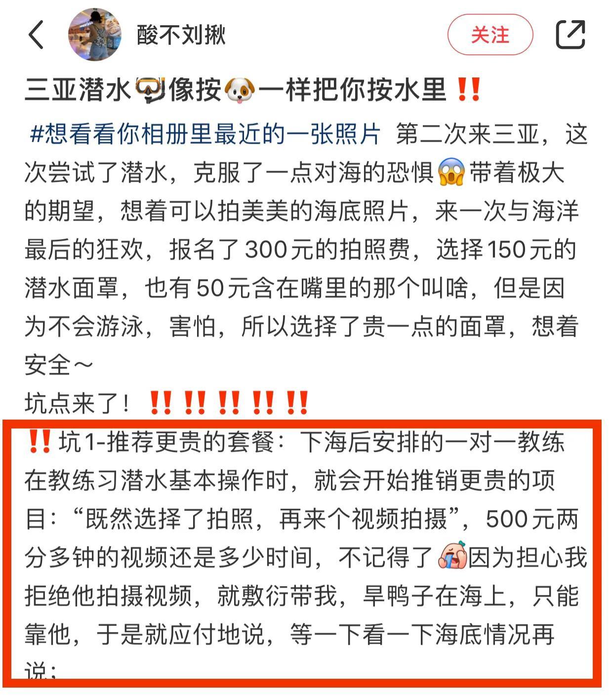 案例4:博主2023年8月29日發帖吐槽,三亞潛水被坑,報名300元拍照費用,50元咬嘴,150元面鏡,由於博主是旱鴨子,沒有游泳潛水經驗,海上生命就交給教練,第一步選擇了拍照,第二步就推銷500元兩個視頻,被遊客拒絕了。