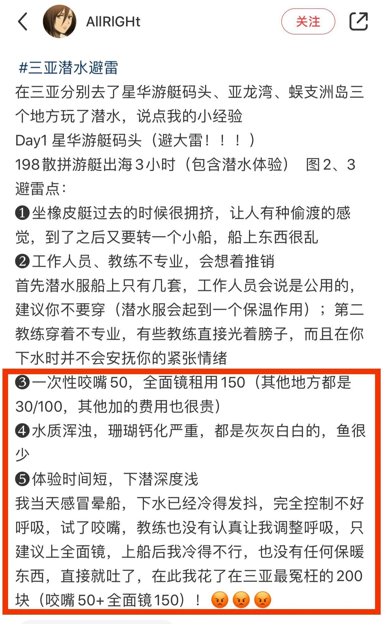 案例2:一位博主2024年2月10日分別在三亞亞龍灣、蜈支洲島、星華遊艇碼頭潛水進行了比較,其中提出星華遊艇碼頭潛水質量較差,快艇出海速度較快,潛水教練不專業,只想着推銷遊樂項目,潛水服只有幾套是公用的,愛穿不穿隨便你,一次性咬嘴50元,別的地方賣30元,全面鏡別的地方賣100元,這裏賣150元,(200元感覺花了冤枉錢),最糟心事情是,潛水地方海水渾濁,魚很少,珊瑚老化,體驗時間短,潛水深度不夠,最差一次體驗,其他蜈支洲島和亞龍灣素有不足之處,但是博主說服務態度很好,教練人很好,體驗感差就是因爲遊客太多、或者天氣原因。