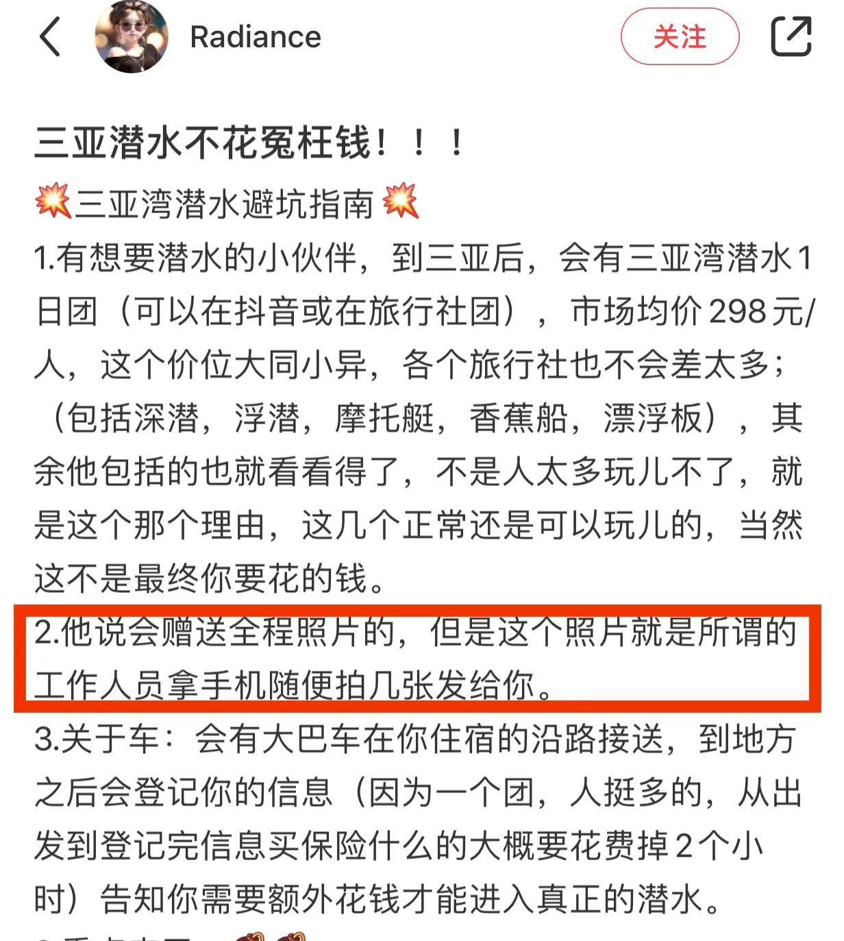 案例3:這位博主2023年8月份發帖,吐槽三亞一日遊潛水,可以網購預定套餐也可以找旅行社預定,還有很多拉客阿公阿婆小販,一日遊潛水報名只需要298元,包含項目很多(摩托艇、深潛、浮潛、香蕉船等),推銷時候感覺你花300元要玩出1000塊錢性價比,實際情況怎麼樣呢?