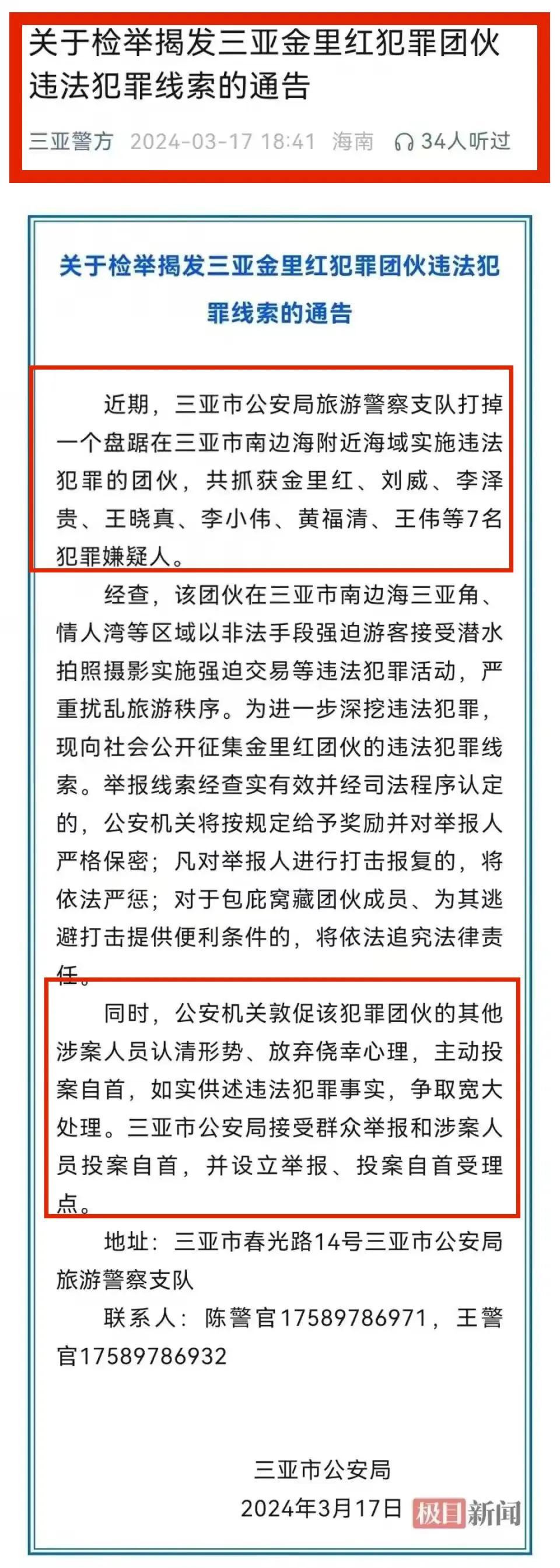 3月17日,三亞市公安局發佈《關於檢舉揭發三亞金裏紅犯罪團伙違法犯罪線索的通告》。