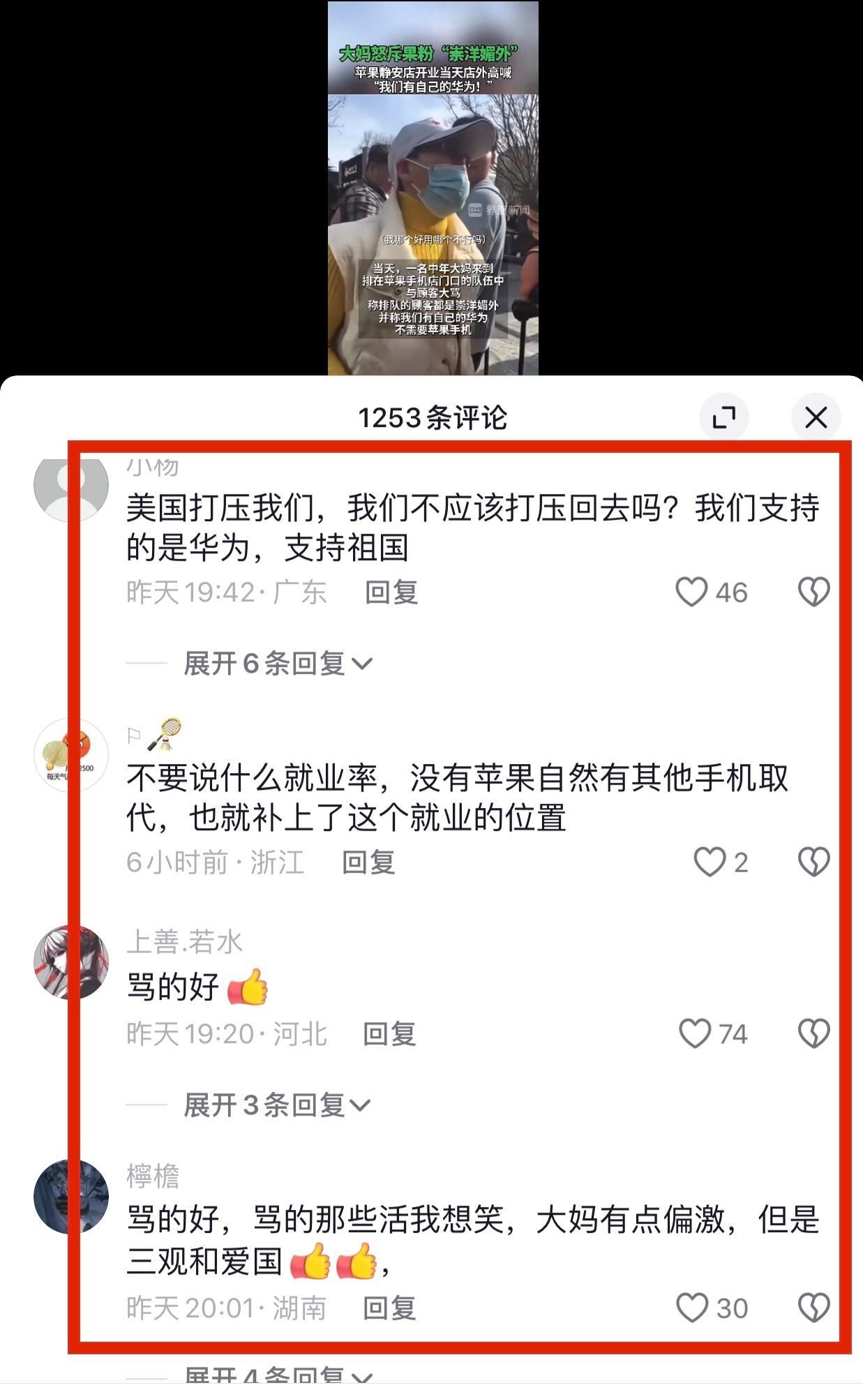 這位上海大媽的言論在網絡上掀起一陣狂潮,留言區很多網友支持大媽做得對,應該支持國貨,大媽雖然言論過激了,但是她有一顆熱愛的心,有些網友說沒有蘋果手機,也有其他企業解決就業問題。