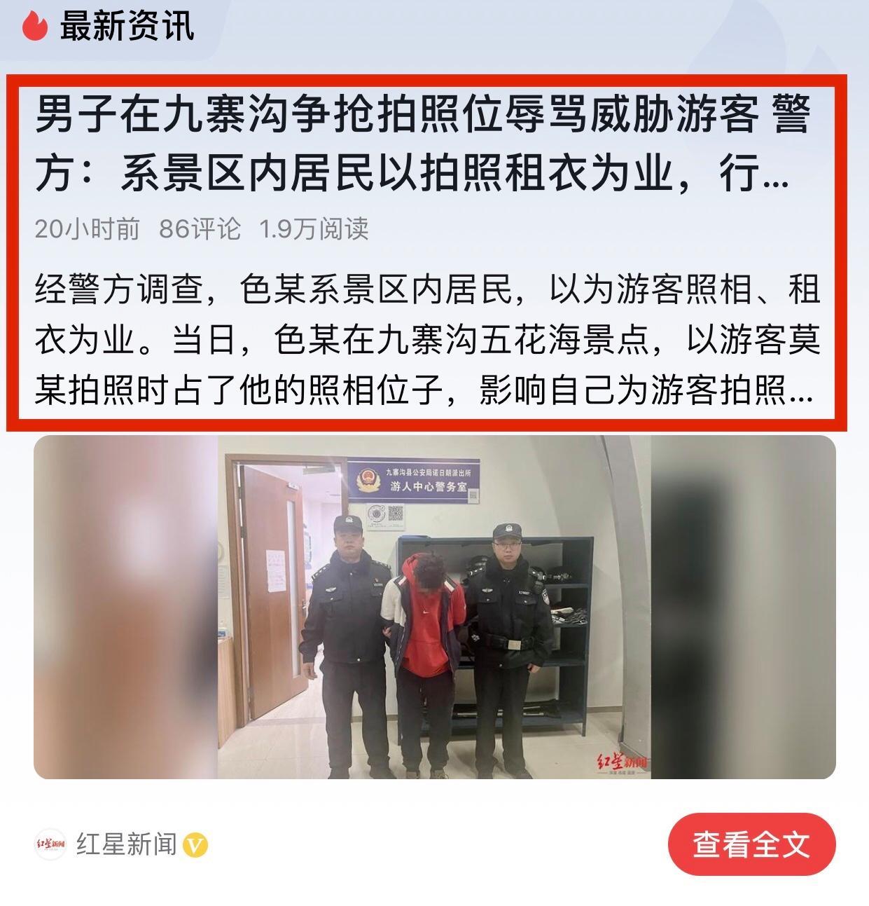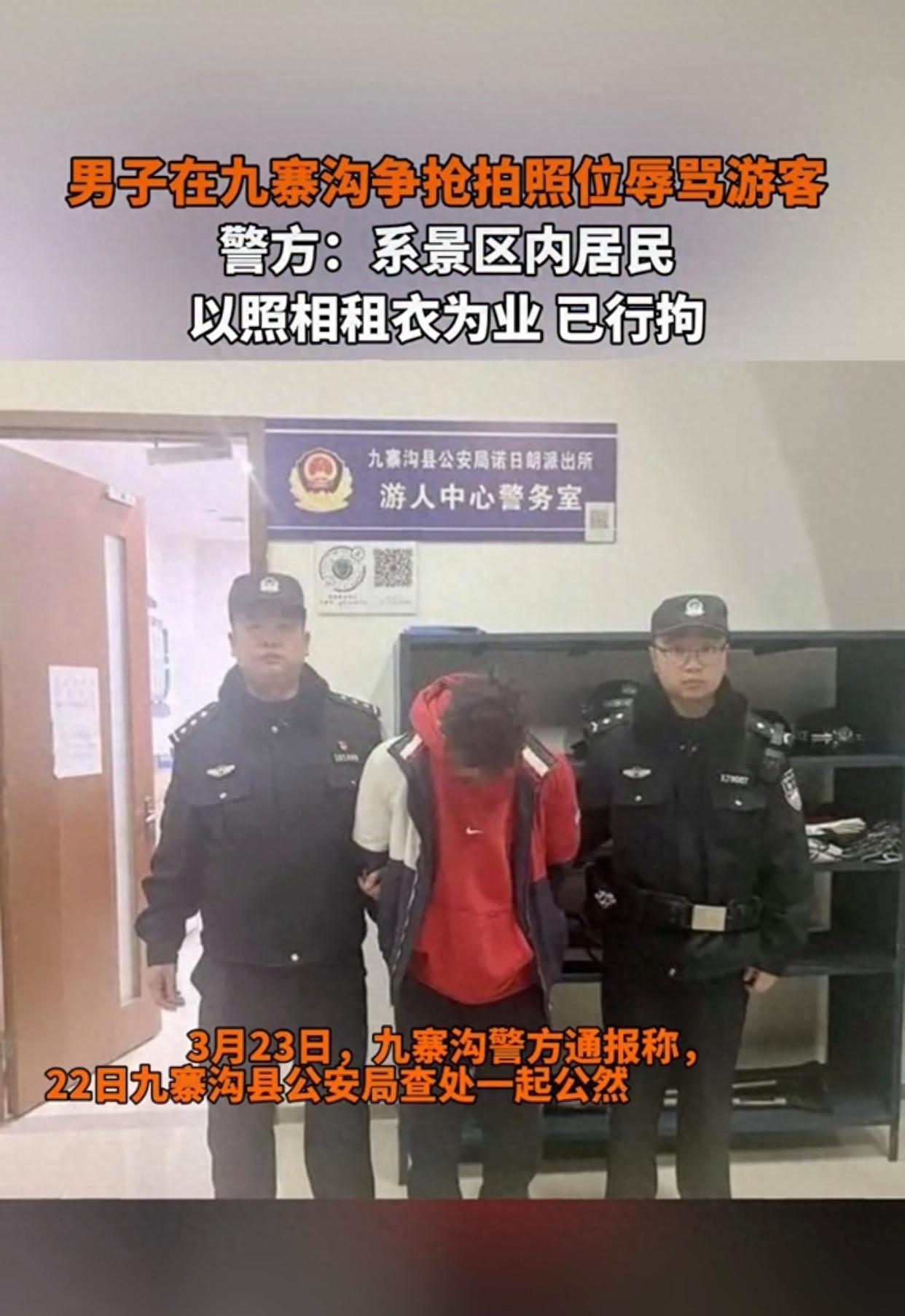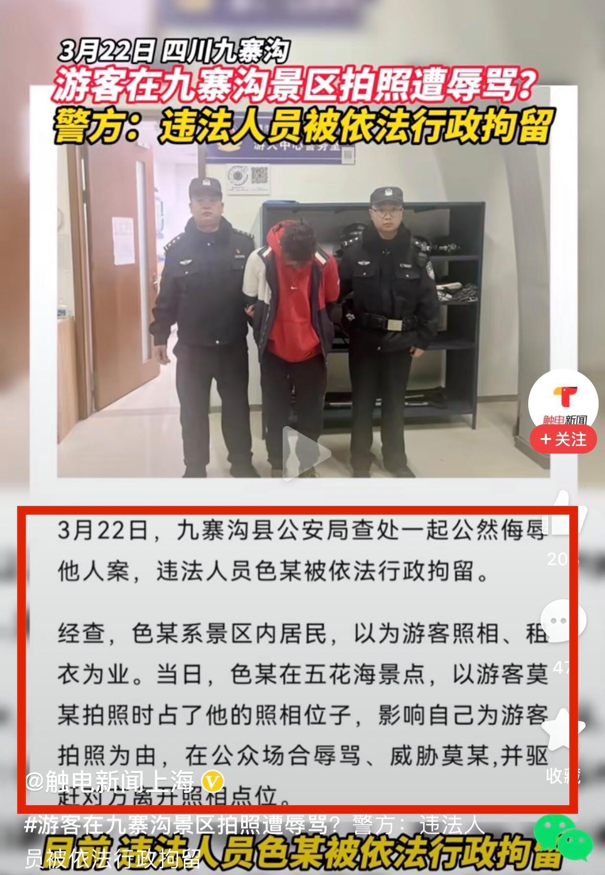 九寨溝官方通報結果出來了:經警方調查,色某系景區內居民,以爲遊客照相、租衣爲業。當日,色某在九寨溝五花海景點,以遊客莫某拍照時佔了他的照相位子,影響自己爲遊客拍照爲由,在公衆場合辱罵、威脅莫某,並驅趕對方離開照相點位。最終,違法人員色某被九寨溝警方行政拘留。