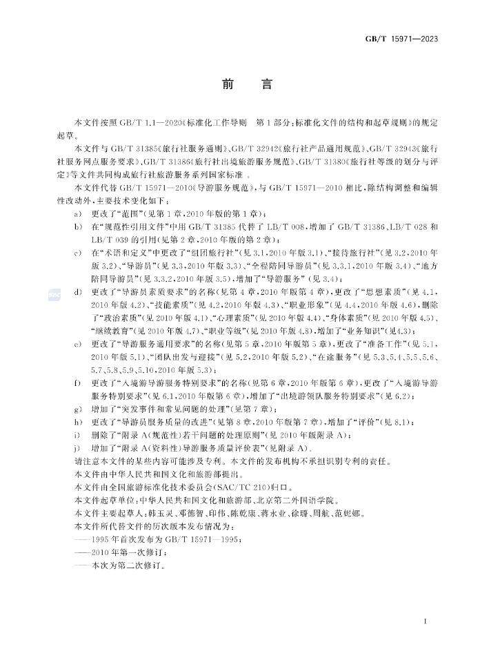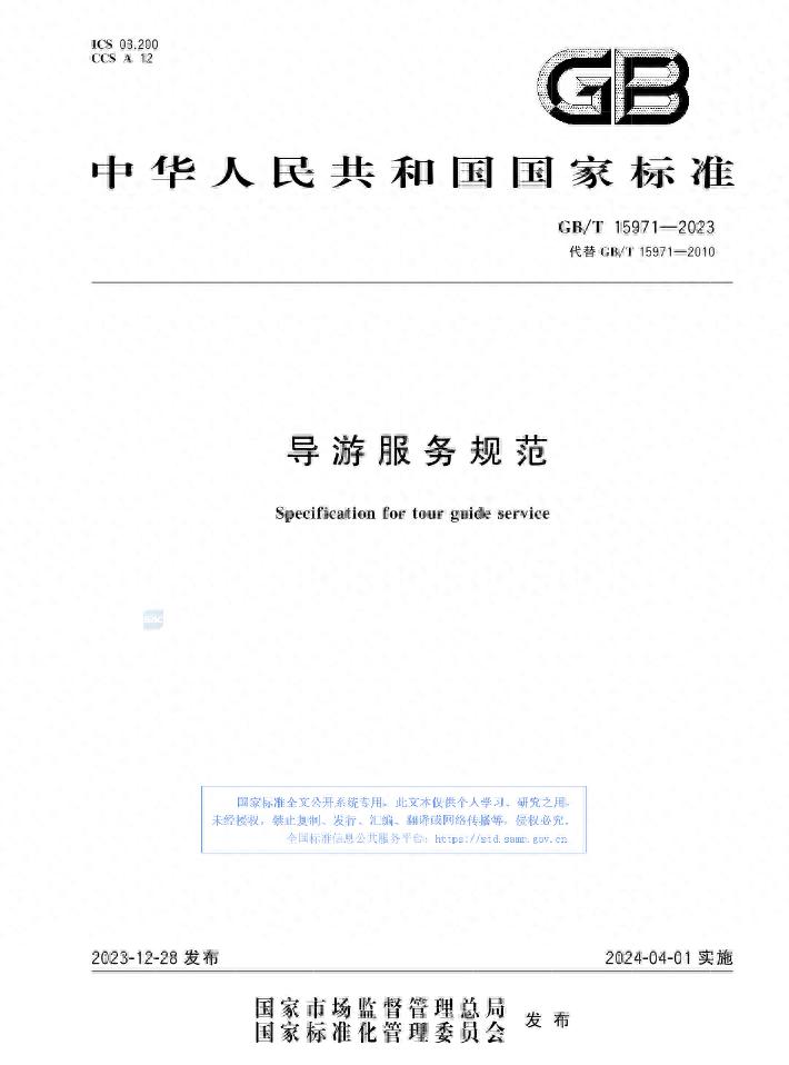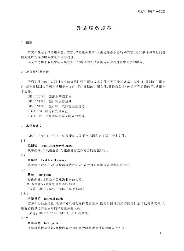 據全國旅遊標準化技術委員會消息,國家標準《導遊服務規範》(GB/T 15971-2023)將於2024年4月1日起實施。全文如下: