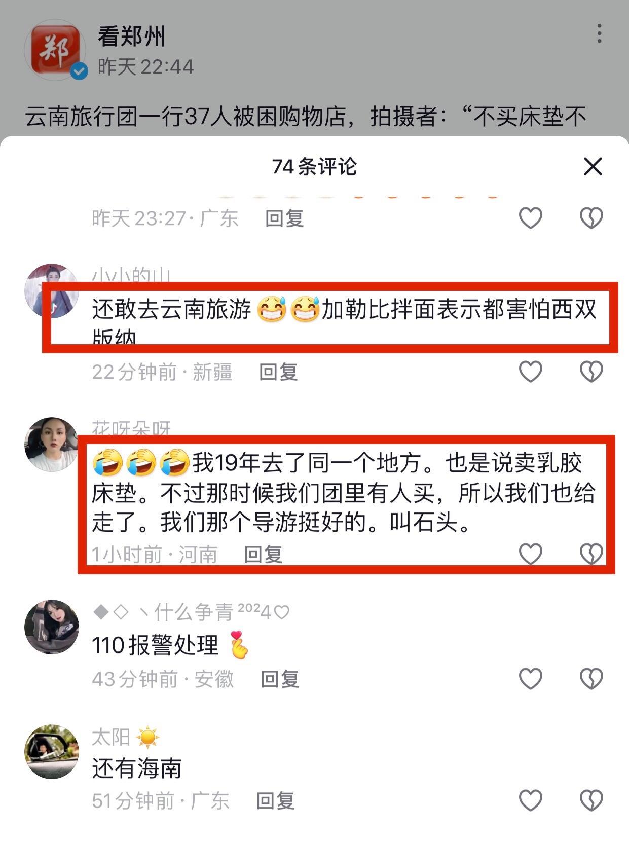 西雙版納又有旅遊團被坑了,2024年3月26日,根據《看鄭州》發佈一則視頻,有博主拍視頻曝光西雙版納跟團遊,視頻裏一位女子口述雲南西雙版納賣乳膠牀墊的地方,視頻中很多遊客在一個房間裏,裏面有很多牀墊,一些人站着、有些遊客躺在牀墊上睡覺,看似無奈,不讓走。
