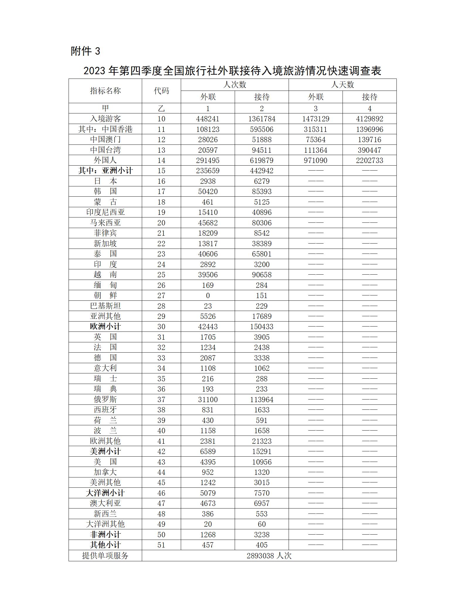 2023年第四季度全國旅行社入境旅遊外聯44.82萬人次、147.31萬人天;接待136.18萬人次、412.99萬人天。入境旅遊單項服務289.30萬人次。(詳見附件3)