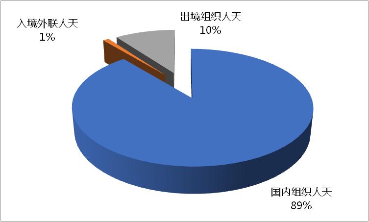 按照國內組織人天、入境外聯人天、出境組織人天三項指標,國內旅遊、入境旅遊、出境旅遊市場人天所佔份額依次爲89%、1%、10%。(見圖7)