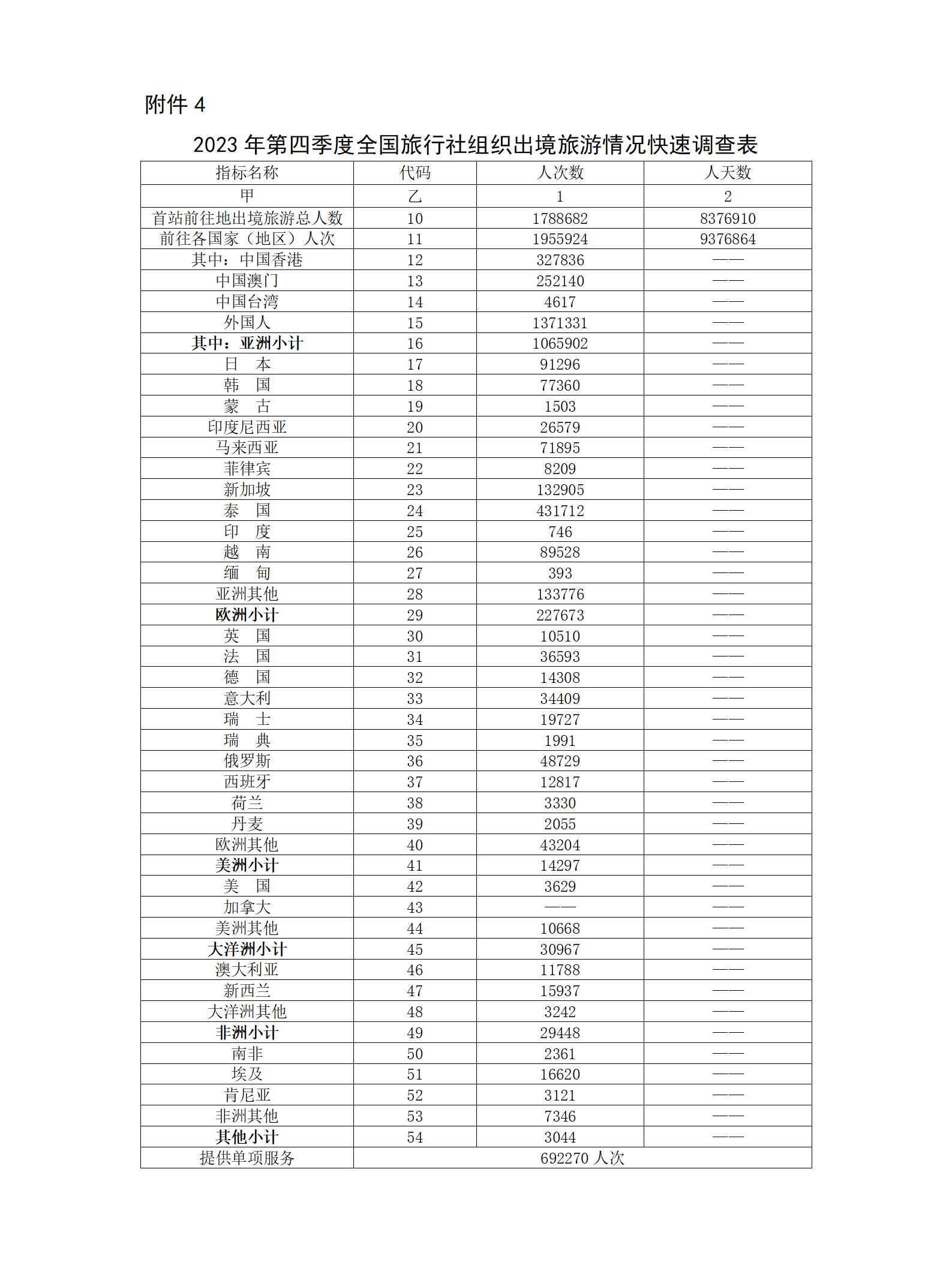 2023年第四季度全國旅行社出境旅遊組織195.59萬人次、937.69萬人天。出境旅遊單項服務69.23萬人次。(詳見附件4)