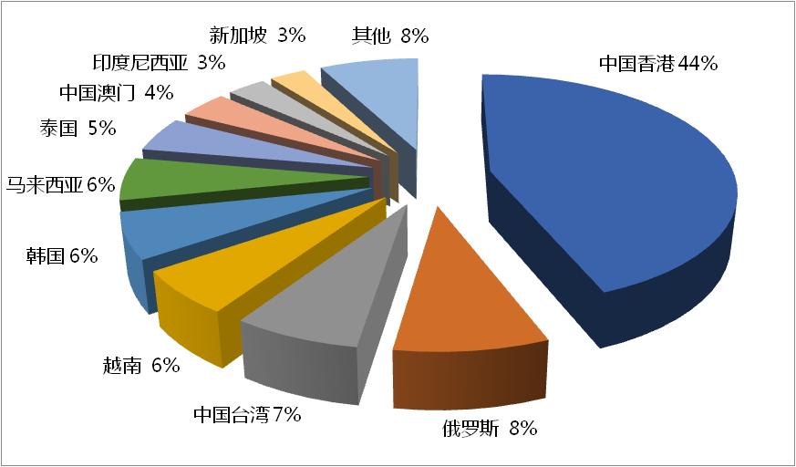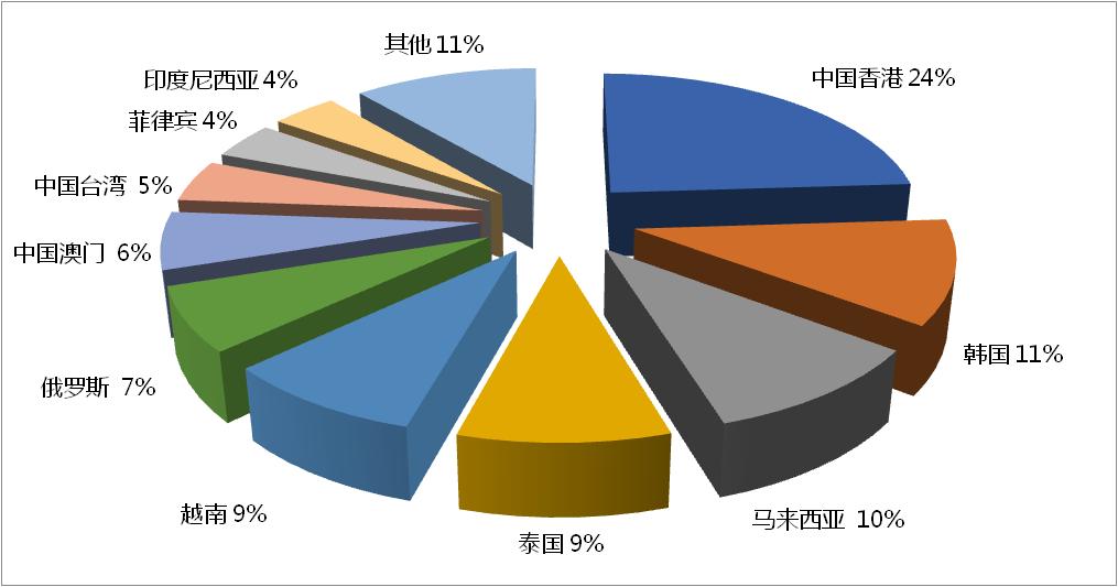 第四季度旅行社入境旅遊接待人次排名前十位的客源地國家或地區由高到低依次爲中國香港、俄羅斯、中國臺灣、越南、韓國、馬來西亞、泰國、中國澳門、印度尼西亞、新加坡。(見圖4)