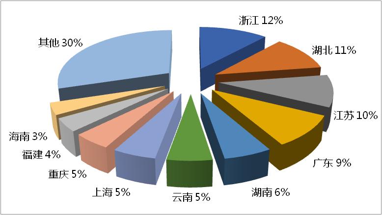 第四季度旅行社國內旅遊接待人次排名前十位的地區由高到低依次爲浙江、湖北、江蘇、廣東、湖南、雲南、上海、重慶、福建、海南。(見圖2)
