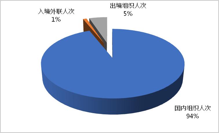 按照國內組織人次、入境外聯人次、出境組織人次三項指標,國內旅遊、入境旅遊、出境旅遊市場人次所佔份額依次爲94%、1%和5%。(見圖6)