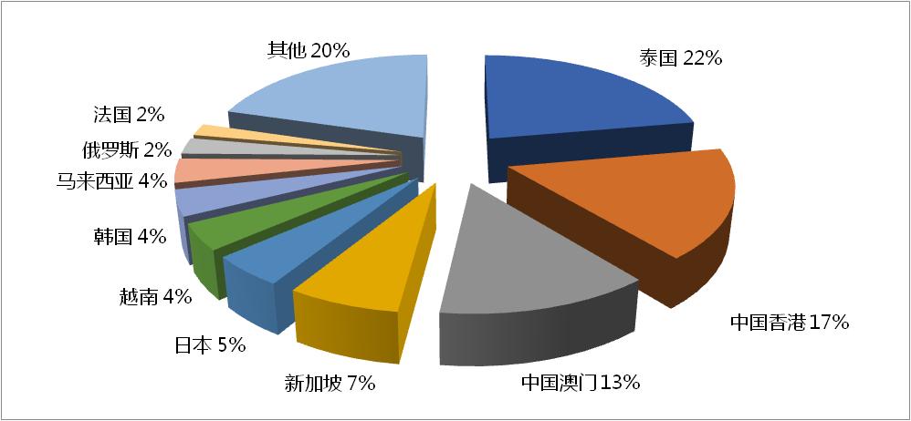 第四季度旅行社出境旅遊組織人次排名前十位的目的地國家或地區由高到低依次爲泰國、中國香港、中國澳門、新加坡、日本、越南、韓國、馬來西亞、俄羅斯、法國。(見圖5)