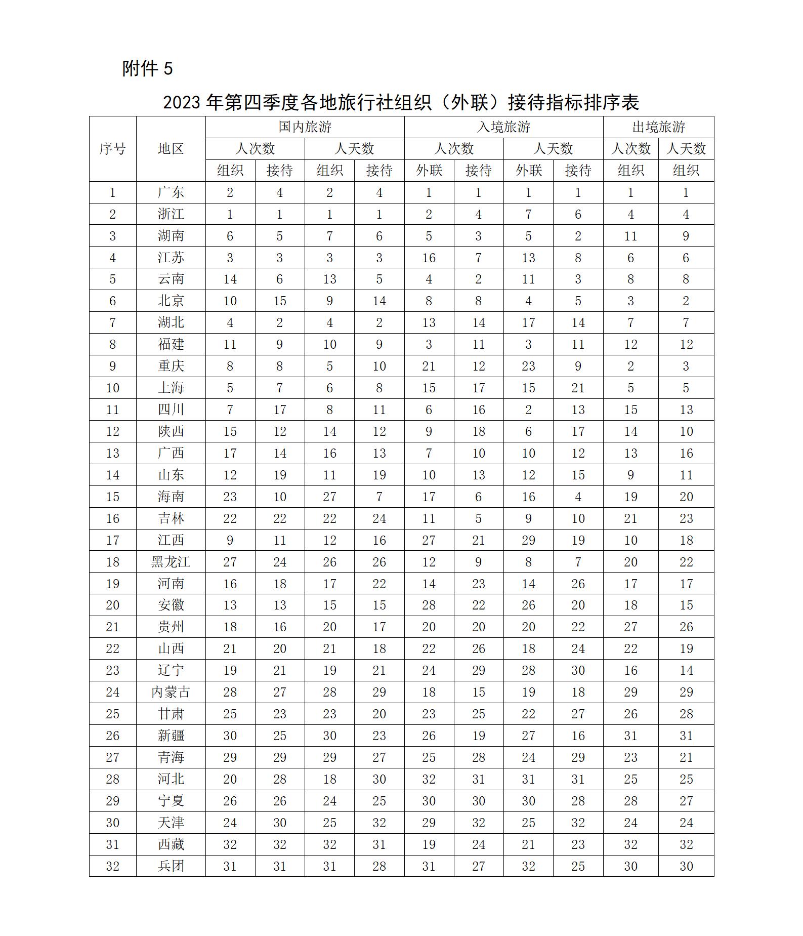 2023年第四季度旅行社三大市場組織(外聯)接待人次(人天)彙總排序前十位的地區由高到低依次爲廣東、浙江、湖南、江蘇、雲南、北京、湖北、福建、重慶、上海。(詳見附件5)