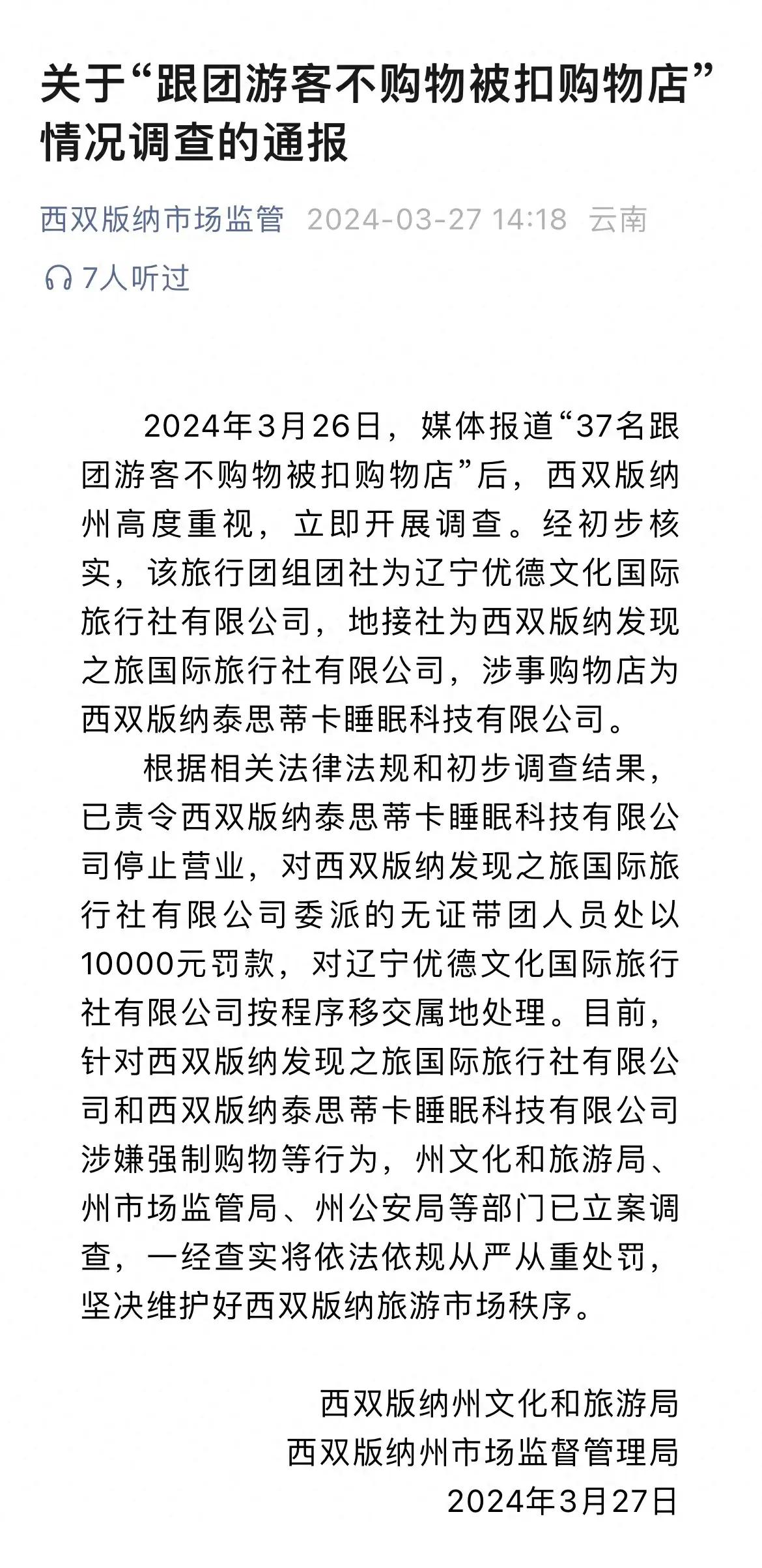 3月27日,西雙版納州文化和旅遊局、西雙版納州市場監督管理局發佈關於“跟團遊客不購物被扣購物店”情況調查的通報。