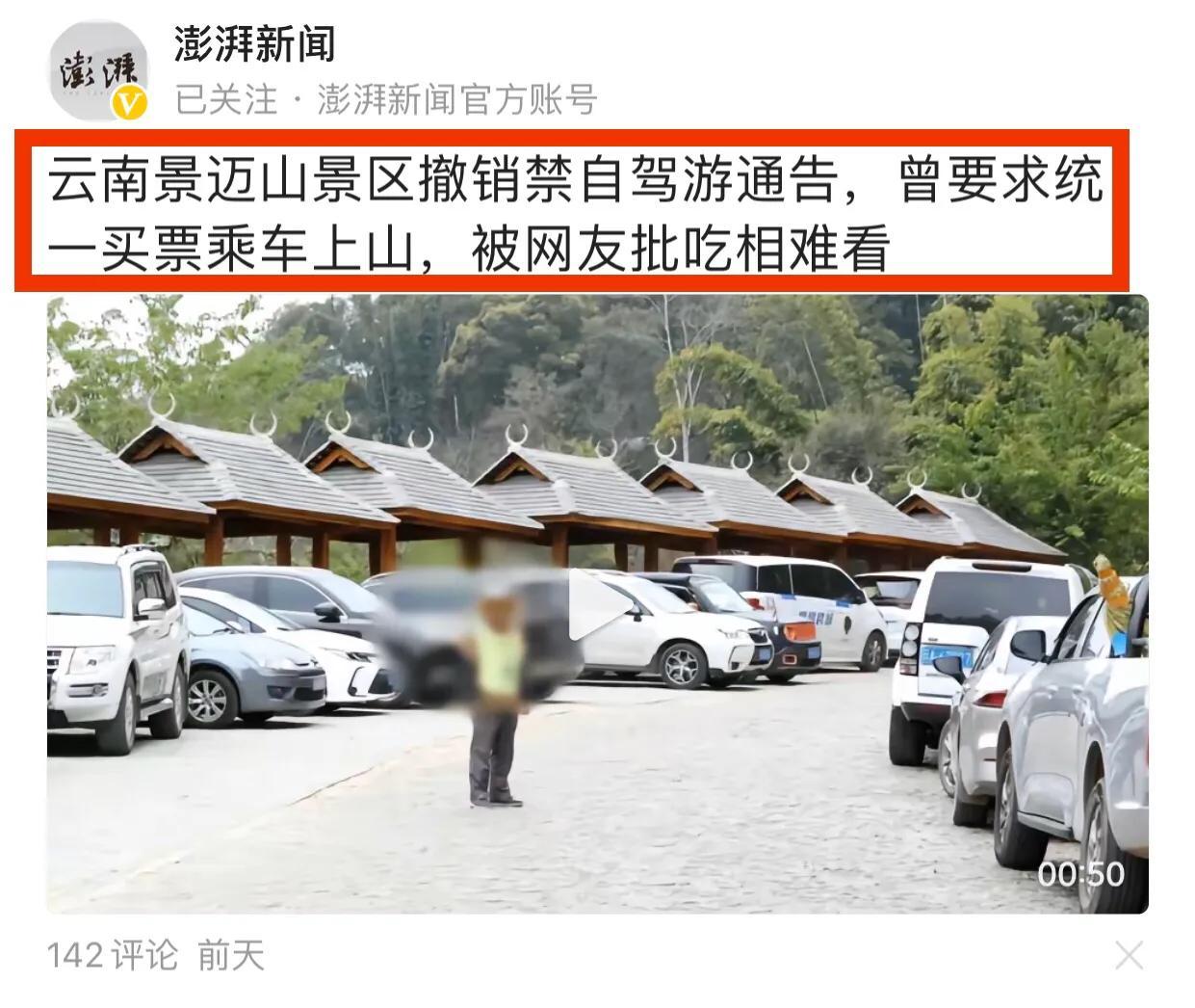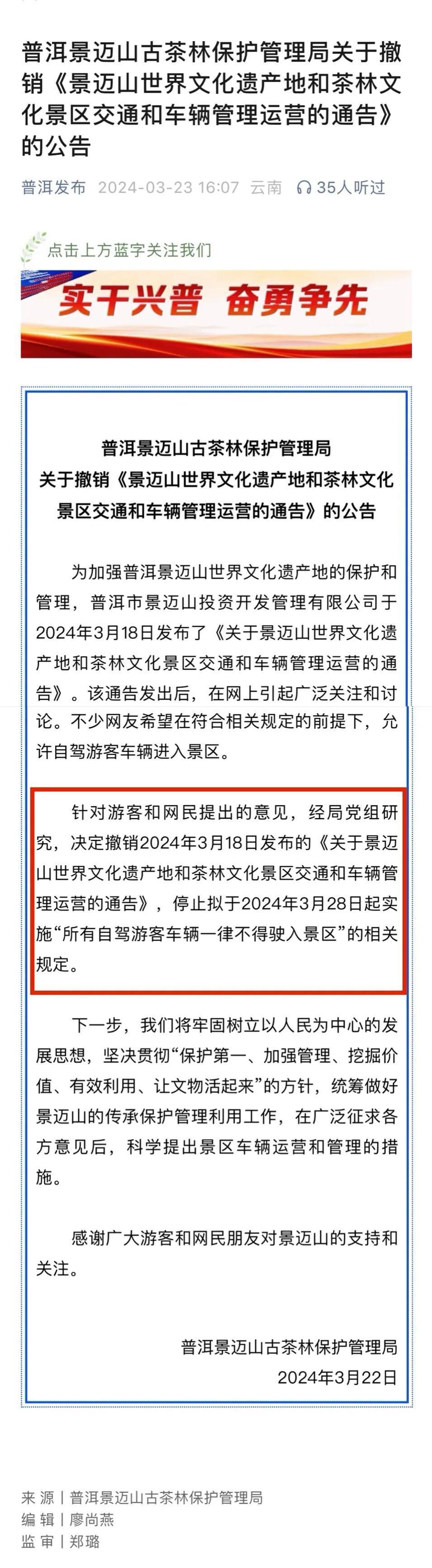輿論監督,當地管理部門也虛心聽取了意見,3月23日,根據《普洱發佈》官媒公衆號消息:針對遊客和網民提出的意見,經局黨組研究,決定撤銷2024年3月18日發佈的《關於景邁山世界文化遺產地和茶林文化景區交通和車輛管理運營的通告》,停止擬於2024年3月28日起實施“所有自駕遊客車輛一律不得駛入景區”的相關規定。