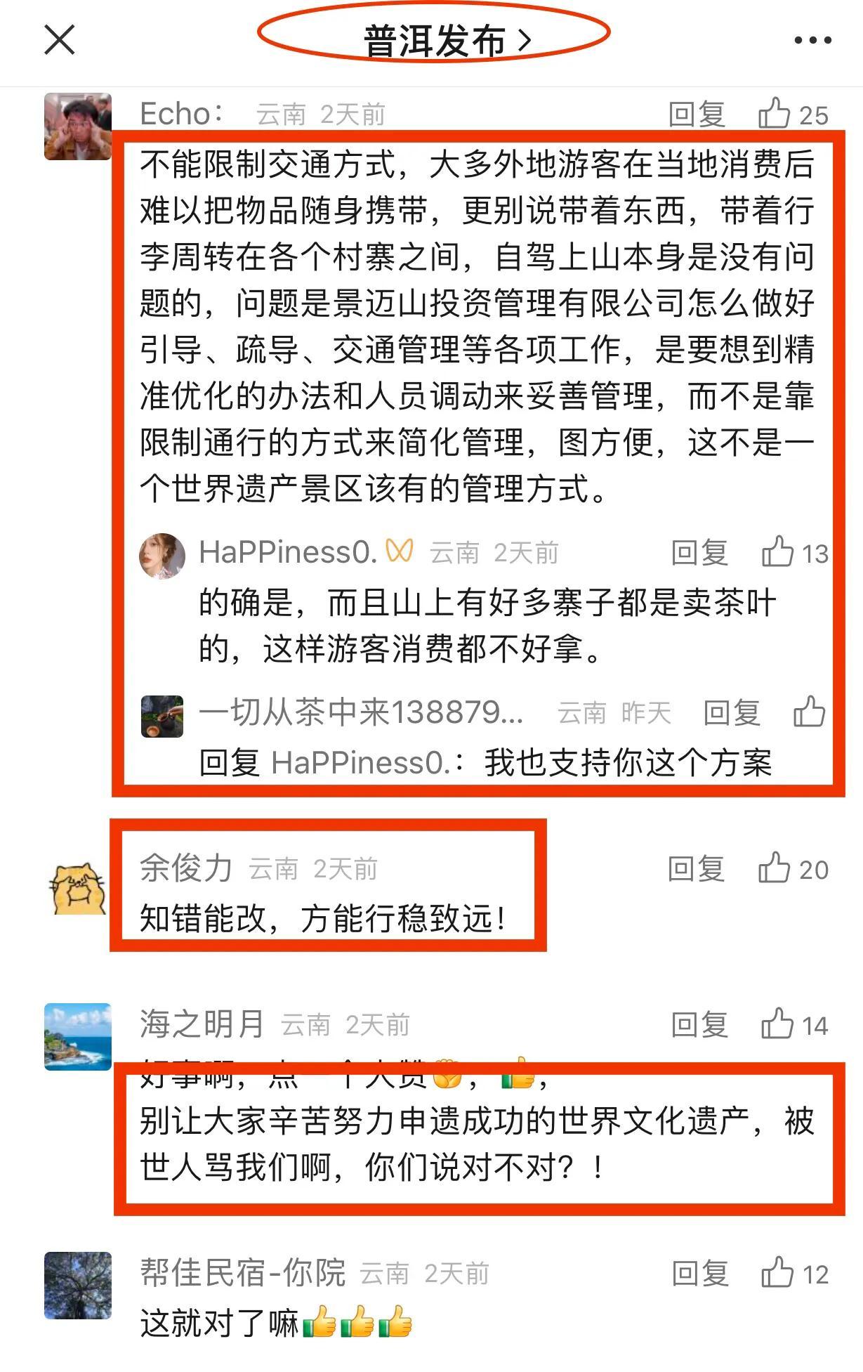 網友對景邁山撤銷禁止自駕遊進入的公告表示點贊,網友們並發表一些建議和觀點: