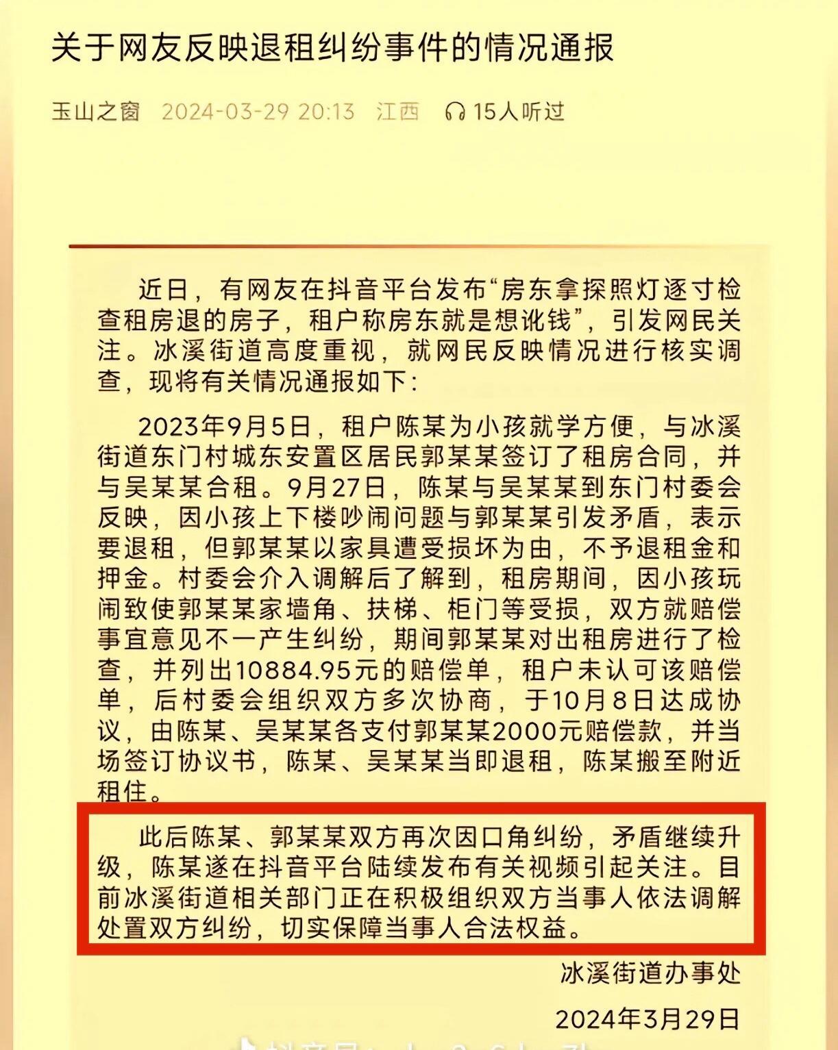 3月28日江西上饒市玉山縣房東與租客一場退房賠付鬧劇衝上熱搜,算是把玉山這個名不見經傳小城帶火了,一夜之間火遍大江南北,女子爲了照顧孩子讀書,在學校旁邊租了一間房子,1200元一個月,由於小孩子上下樓吵到房東,雙方發生矛盾,最後退房,房東拿着探照燈對房間傢俱,地板馬桶、熱水器、牀板逐個檢查,最後列出16個大項和29個小項損耗賠償,金額1萬元左右,雙方調解最後賠付4000元達成和解,事情過去半年,房東和租客往事再次戰火升級,租客一氣之下把房東提燈檢查房的事情抖露出來,直接讓房東上熱搜,也帶紅了上饒地區。